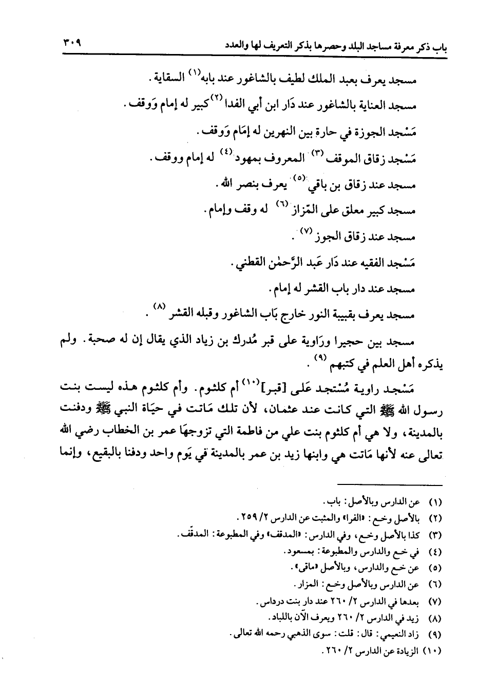 ومؤذن وإمام وفيه بئر وعلى بابه مطهرة مسجد يعرف بعبد الملك لطيف بالشاغور عند بابه السقاية مسجد العناية بالشاغور عند دار ابن أبي الفدا كبير له إمام ووقف مسجد الجوزة في حارة بين النهرين له إمام ووقف مسجد زقاق الموقف المعروف بمهود له إمام ووقف مسجد عند زقاق بن باقي يعرف بنصر الله مسجد كبير معلق على المزاز له وقف وإمام مسجد عند زقاق الجوز مسجد الفقيه عند دار عبد الرحمن القطني مسجد عند دار باب القشر له إمام مسجد يعرف بقبيبة النور خارج باب الشاغور وقبله القشر مسجد بين حجيرا وراوية على قبر مدرك بن زياد الذي يقال إن له صحبة ولم يذكره أهل العلم في كتبهم مسجد راوية مستجد على قبر أم كلثوم وأم كلثوم هذه ليست بنت رسول الله (صلى الله عليه وسلم) التي كانت عند عثمان لأن تلك ماتت في حياة النبي (صلى الله عليه وسلم) ودفنت بالمدينة ولا هي أم كلثوم بنت علي من فاطمة التي تزوجها عمر بن الخطاب رضي الله تعالى عنه لأنها ماتت هي وابنها زيد بن عمر بالمدينة في يوم واحد ودفنا بالبقيع وإنما