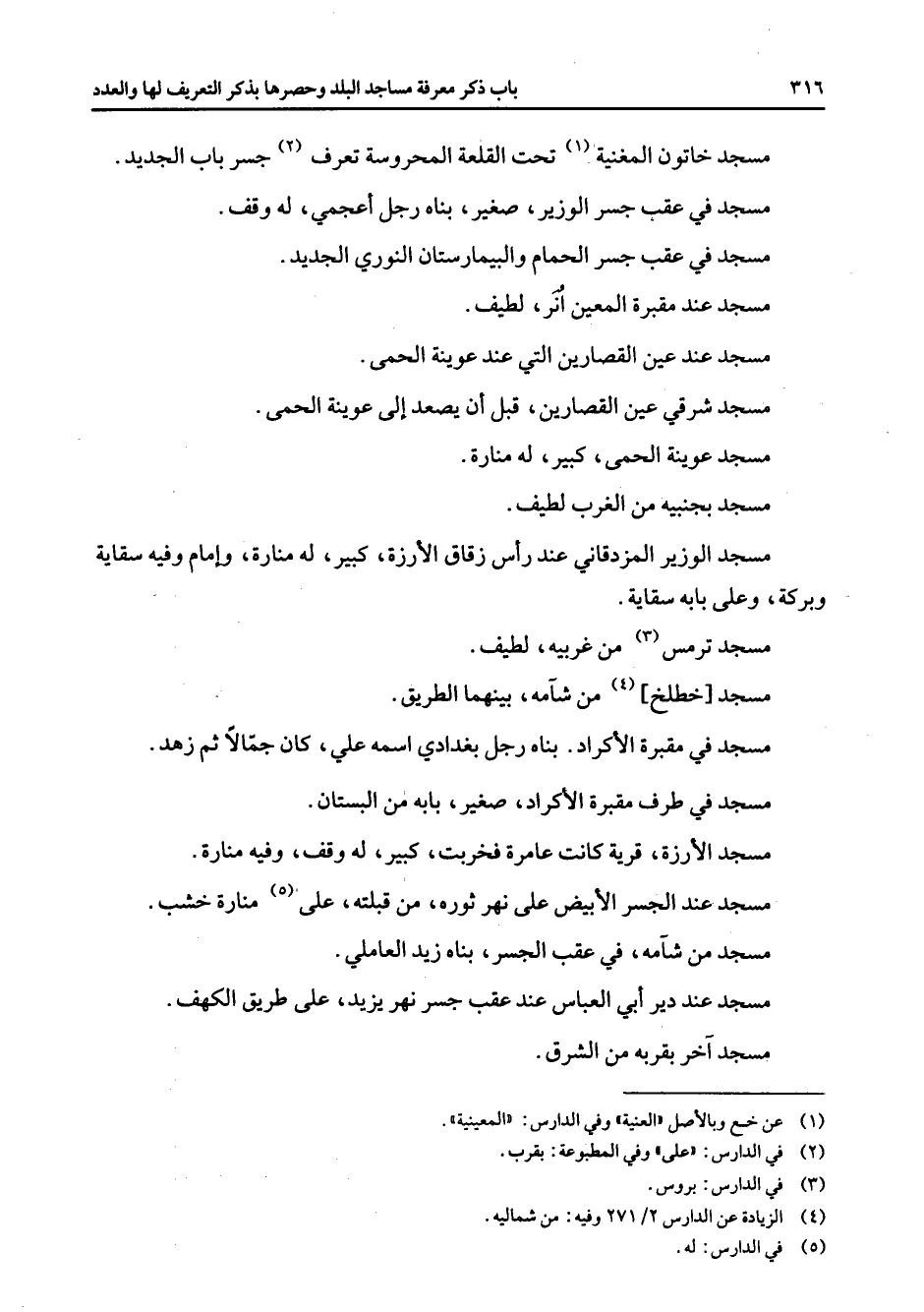 مسجد خاتون المغنية تحت القلعة المحروسة تعرف جسر باب الجديد مسجد في عقب جسر الوزير صغير بناه رجل أعجمي له وقف مسجد في عقب جسر الحمام والبيمارستان النوري الجديد مسجد عند مقبرة المعين أنر لطيف مسجد عند عين القصارين التي عند عوينة الحمى مسجد شرقي عين القصارين قبل أن يصعد إلى عوينة الحمى مسجد عوينة الحمى كبير له منارة مسجد بجنبيه من الغرب لطيف مسجد الوزير المزدقاني عند رأس زقاق الأرزة كبير له منارة وإمام وفيه سقاية وبركة وعلى بابه سقاية مسجد ترمس من غربيه لطيف مسجد خطلخ من شامه بينهما الطريق مسجد في مقبرة الأكراد بناه رجل بغدادي اسمه علي كان جمالا ثم زهد مسجد في طرف مقبرة الأكراد صغير بابه من البستان مسجد الأرزة قرية كانت عامرة فخربت كبير له وقف وفيه منارة