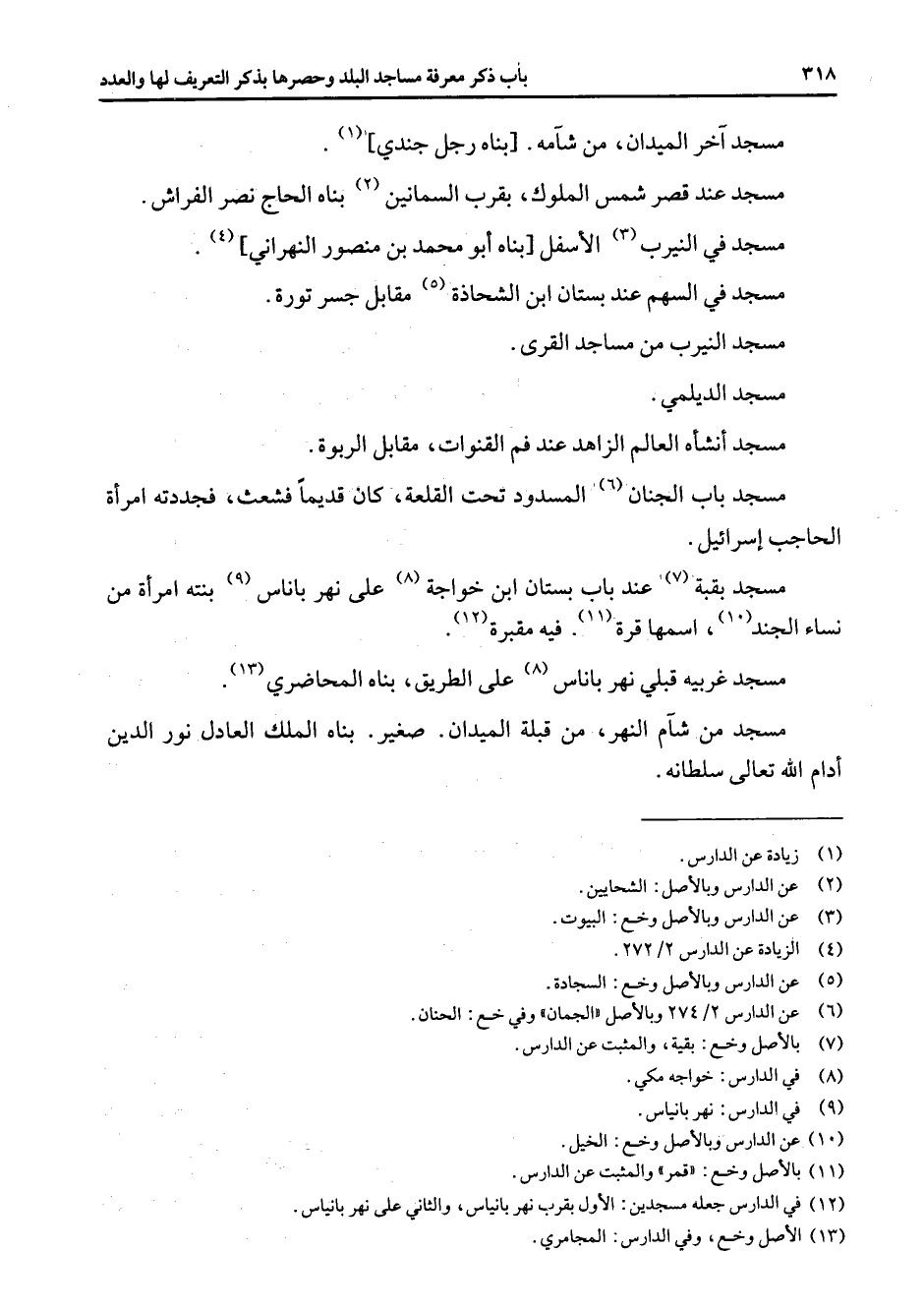 مسجد آخر الميدان من شامه بناه رجل جندي (1) مسجد عند قصر شمس الملوك بقرب السمانين (2) بناه الحاج نصر الفراش مسجد في النيرب (3) الأسفل بناه أبو محمد بن منصور النهراني (4) مسجد في السهم عند بستان ابن الشحاذة (5) مقابل جسر تورة مسجد النيرب من مساجد القرى مسجد الديلمي مسجد أنشأه العالم الزاهد عند فم القنوات مقابل الربوة مسجد باب الجنان (6) المسدود تحت القلعة كان قديما فشعث فجددته امرأة الحاجب إسرائيل مسجد بقبة (7) عند باب بستان ابن خواجة (8) على نهر باناس (9) بنته امرأة من نساء الجند (10) اسمها قرة (11) فيه مقبرة (12) مسجد غربيه قبلي نهر باناس (8) على الطريق بناه المحاضري (13) مسجد من شآم النهر من قبلة الميدان صغير بناه الملك العادل نور الدين أدام الله تعالى سلطانه