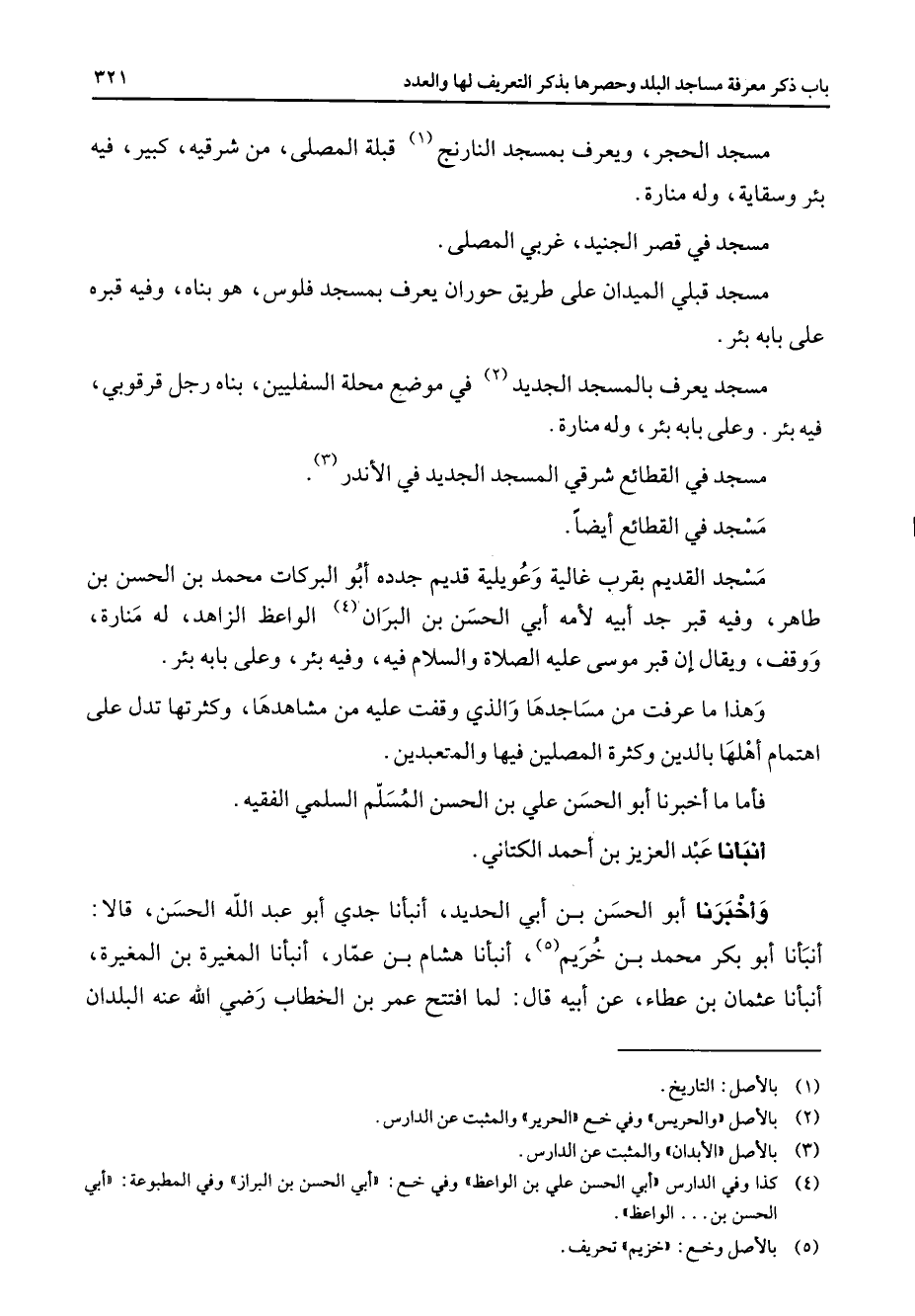 مسجد الحجر ويعرف بمسجد النارنج (1) قبلة المصلى من شرقيه كبير فيه بئر وسقاية وله منارة مسجد في قصر الجنيد غربي المصلى مسجد قبلي الميدان على طريق حوران يعرف بمسجد فلوس هو بناه وفيه قبره على بابه بئر مسجد يعرف بالمسجد الجديد (2) في موضع محلة السفليين بناه رجل قرقوبي فيه بئر وعلى بابه بئر وله منارة مسجد في القطائع شرقي المسجد الجديد في الأندر (3) مسجد في القطائع أيضا مسجد القديم بقرب غالية وعويلية قديم جدده أبو البركات محمد بن الحسن بن طاهر وفيه قبر جد أبيه لأمه أبي الحسن بن البران (4) الواعظ الزاهد له منارة ووقف ويقال إن قبر موسى عليه الصلاة والسلام فيه وفيه بئر وعلى بابه بئر وهذا ما عرفت من مساجدها والذي وقفت عليه من مشاهدها وكثرتها تدل على اهتمام أهلها بالدين وكثرة المصلين فيها والمتعبدين فأما ما أخبرنا أبو الحسن علي بن الحسن المسلم السلمي الفقيه أنبأنا عبد العزيز بن أحمد الكتاني وأخبرنا أبو الحسن بن ابي الحديد أنبأنا جدي أبو عبد الله الحسن قالا أنبأنا أبو بكر محمد بن خريم (5) أنبأنا هشام بن عمار أنبأنا المغيرة بن المغيرة أنبأنا عثمان بن عطاء عن أبيه قال لما افتتح عمر بن الخطاب Bهـ البلدان