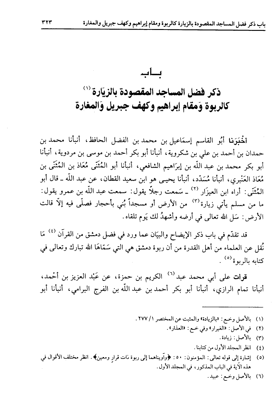 " باب ذكر فضل المساجد المقصودة بالزيارة (1) كالربوة ومقام إبراهيم وكهف جبريل والمغارة " أخبرنا أبو القاسم إسماعيل بن محمد بن الفضل الحافظ أنبأنا محمد بن حمدان بن أحمد بن علي بن شكروية أنبأنا أبو بكر أحمد بن موسى بن مردوية أنبأنا أبو بكر محمد بن عبد الله بن إبراهيم الشافعي أنبأنا أبو المثنى معاذ بن المثنى بن معاذ العنبري أنبأنا مسدد أنبأنا يحيى هو ابن سعيد القطان عن عبد الله قال أبو المثنى أراه ابن العيزار (2) سمعت رجلا يقول سمعت عبد الله بن عمرو يقول ما من مسلم يأتي زيارة (3) من الأرض أو مسجدا بني بأحجار فصلى فيه إلا قالت الأرض سل الله تعالى في أرضه واشهد لك يوم تلقاه قد تقدم في باب ذكر الإيضاح والبيان عما ورد في فضل دمشق من القرآن (4) ما نقل عن العلماء من أهل القدرة من أن ربوة دمشق هي التي سماها الله تبارك وتعالى في كتابه بالربوة (5) قرأت على أبي محمد عبد (6) الكريم بن حمزة عن عبد العزيز بن أحمد أنبأنا تمام الرازي أنبأنا أبو بكر أحمد بن عبد الله بن الفرج البرامي أنبأنا أبو