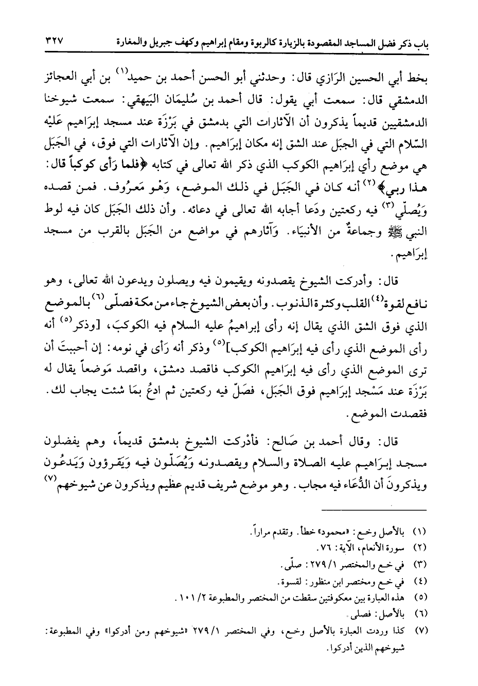 بخط أبي الحسين الرازي قال وحدثني أبو الحسن أحمد بن حميد (1) بن أبي العجائز الدمشقي قال سمعت أبي يقول قال أحمد بن سليمان البيهقي سمعت شيوخنا الدمشقيين قديما يذكرون أن الآثارات التي بدمشق في برزة عند مسجد إبراهيم عليه السلام التي في الجبل عند الشق إنه مكان إبراهيم وإن الآثارات التي فوق في الجبل هي موضع رأي إبراهيم الكوكب الذي ذكر الله تعالى في كتابه " فلما رأى كوكبا قال هذا ربي " (2) أنه كان في الجبل في ذلك الموضع وهو معروف فمن قصده ويصلي (3) فيه ركعتين ودعا أجابه الله تعالى في دعائه وأن ذلك الجبل كان فيه لوط النبي (صلى الله عليه وسلم) وجماعة من الأنبياء وآثارهم في مواضع من الجبل بالقرب من مسجد إبراهيم قال وأدركت الشيوخ يقصدونه ويقيمون فيه ويصلون ويدعون الله تعالى وهو نافع لقوة القلب وكثرة الذنوب وأن بعض الشيوخ جاء من مكة فصلى (6) بالموضع الذي فوق الشق الذي يقال إنه رأى إبراهيم عليه السلام فيه الكوكب وذكر (5) أنه رأى الموضع الذي رأى فيه إبراهيم الكوكب (5) وذكر أنه رأى في نومه إن أحببت أن ترى الموضع الذي رأى فيه إبراهيم الكوكب فاقصد دمشق واقصد موضعا يقال له برزة عند مسجد إبراهيم فوق الجبل فصل فيه ركعتين ثم ادع بما شئت يجاب لك فقصدت الموضع قال وقال أحمد بن صالح فأدركت الشيوخ بدمشق قديما وهم يفضلون مسجد إبراهيم عليه الصلاة والسلام ويقصدونه ويصلون فيه ويقرؤون ويدعون ويذكرون أن الدعاء فيه مجاب وهو موضع شريف قديم عظيم ويذكرون عن شيوخهم (7)