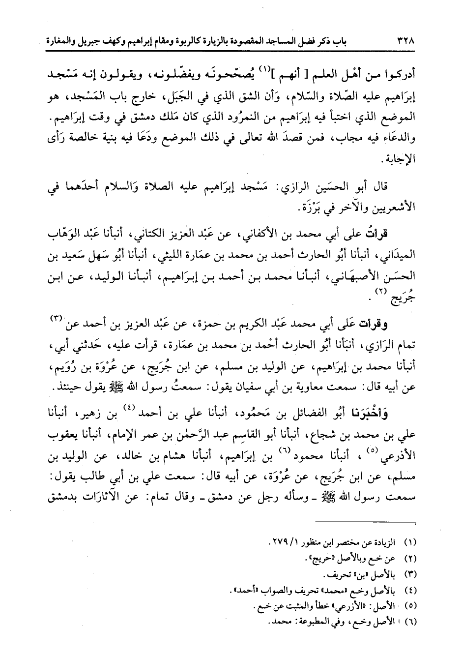 أدركوا من أهل العلم أنهم (1) يصححونه ويفضلونه ويقولون إنه مسجد إبراهيم عليه الصلاة والسلام وأن الشق الذي في الجبل خارج باب المسجد هو الموضع الذي اختبأ فيه إبراهيم من النمرود الذي كان ملك دمشق في وقت إبراهيم والدعاء فيه مجاب فمن قصد الله تعالى في ذلك الموضع ودعا فيه بنية خالصة رأى الإجابة قال أبو الحسين الرازي مسجد إبراهيم عليه الصلاة والسلام أحدهما في الأشعريين والآخر في برزة قرأت على أبي محمد بن الأكفاني عن عبد العزيز الكتاني أنبأنا عبد الوهاب الميداني أنبأنا أبو الحارث أحمد بن محمد بن عمارة الليثي أنبأنا أبو سهل سعيد بن الحسن الاصبهاني أنبأنا محمد بن أحمد بن إبراهيم أنبأنا الوليد عن ابن جريج (2) وقرأت على أبي محمد عبد الكريم بن حمزة عن عبد العزيز بن أحمد عن (3) تمام الرازي أنبأنا أبو الحارث أحمد بن محمد بن عمارة قرأت عليه حدثني أبي أنبأنا محمد بن إبراهيم عن الوليد بن مسلم عن ابن جريج عن عروة بن رويم عن أبيه قال سمعت معاوية بن أبي سفيان يقول سمعت رسول الله (صلى الله عليه وسلم) يقول حينئذ وأخبرنا أبو الفضائل بن محمود أنبأنا علي بن أحمد (4) بن زهير أنبأنا علي بن محمد بن شجاع أنبأنا أبو القاسم عبد الرحمن بن عمر الإمام أنبأنا يعقوب الأذرعي (5) أنبأنا محمود (6) بن إبراهيم أنبأنا هشام بن خالد عن الوليد بن مسلم عن ابن جريج عن عروة عن أبيه قال سمعت علي بن أبي طالب يقول سمعت رسول الله (صلى الله عليه وسلم) وسأله رجل عن دمشق وقال تمام عن الآثارات بدمشق