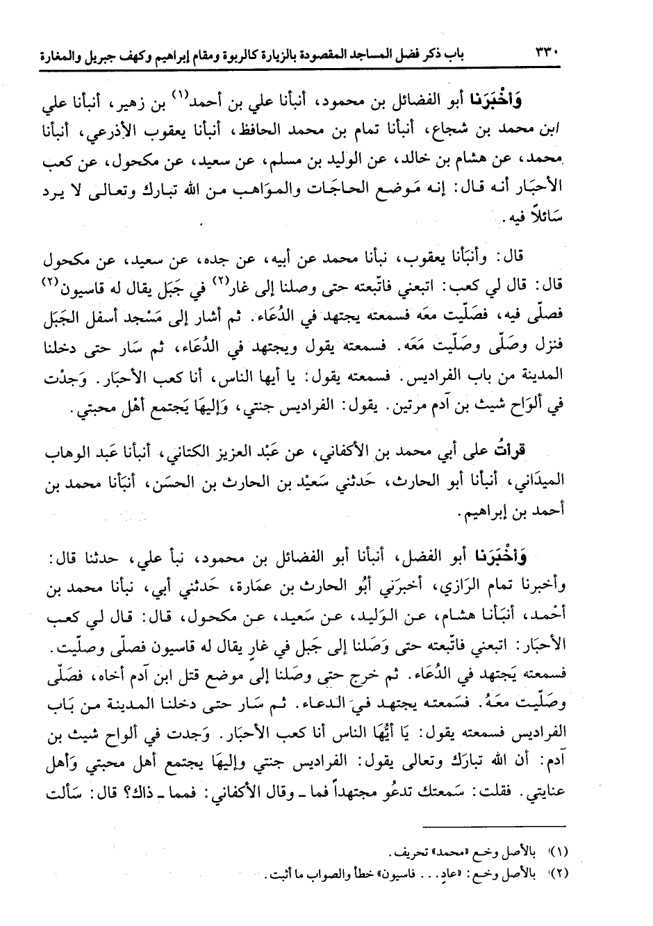 وأخبرنا أبو الفضائل بن محمود أنبأنا علي بن أحمد (1) بن زهير أنبأنا علي ابن محمد بن شجاع أنبأنا تمام بن محمد الحافظ أنبأنا يعقوب الأذرعي أنبأنا محمد عن هشام بن خالد عن الوليد بن مسلم عن سعيد عن مكحول عن كعب الأحبار أنه قال إنه موضع الحاجات والمواهب من الله تبارك وتعالى لا يرد سائلا فيه قال وأنبأنا يعقوب نبأنا محمد عن أبيه عن جده عن سعيد عن مكحول قال قال لي كعب اتبعني فاتبعته حتى وصلنا إلى غار (2) في جبل يقال له قاسيون (2) فصلى فيه فصليت معه فسمعته يجتهد في الدعاء ثم اشار إلى مسجد أسفل الجبل فنزل وصلى وصليت معه فسمعته يقول ويجتهد في الدعاء ثم سار حتى دخلنا المدينة من باب الفراديس فسمعته يقول يا أيها الناس أنا كعب الأحبار وجدت في ألواح شيث بن آدم مرتين يقول الفراديس جنتي وإليها يجتمع أهل محبتي قرأت على أبي محمد بن الأكفاني عن عبد العزيز الكتاني أنبأنا عبد الوهاب الميداني أنبأنا أبو الحارث حدثني سعيد بن الحارث بن الحسن أنبأنا محمد بن أحمد بن إبراهيم وأخبرنا أبو الفضل أنبأنا أبو الفضائل بن محمود نبأ علي حدثنا قال وأخبرنا تمام الرازي أخبرني أبو الحارث بن عمارة حدثني أبي نبأنا محمد بن أحمد أنبأنا هشام عن الوليد عن سعيد عن مكحول قال قال لي كعب الأحبار اتبعني فاتبعته حتى وصلنا إلى جبل في غار يقال له قاسيون فصلى وصليت فسمعته يجتهد في الدعاء ثم خرج حتى وصلنا إلى موضع قتل ابن آدم أخاه فصلى وصليت معه فسمعته يجتهد في الدعاء ثم سار حتى دخلنا المدينة من باب الفراديس فسمعته يقول يا أيها الناس أنا كعب الأحبار وجدت في ألواح شيث بن آدم أن الله تبارك وتعالى يقول الفراديس جنتي وإليها يجتمع أهل محبتي وأهل عنايتي فقلت سمعتك تدعو مجتهدا فما وقال الأكفاني فمما ذاك قال سألت