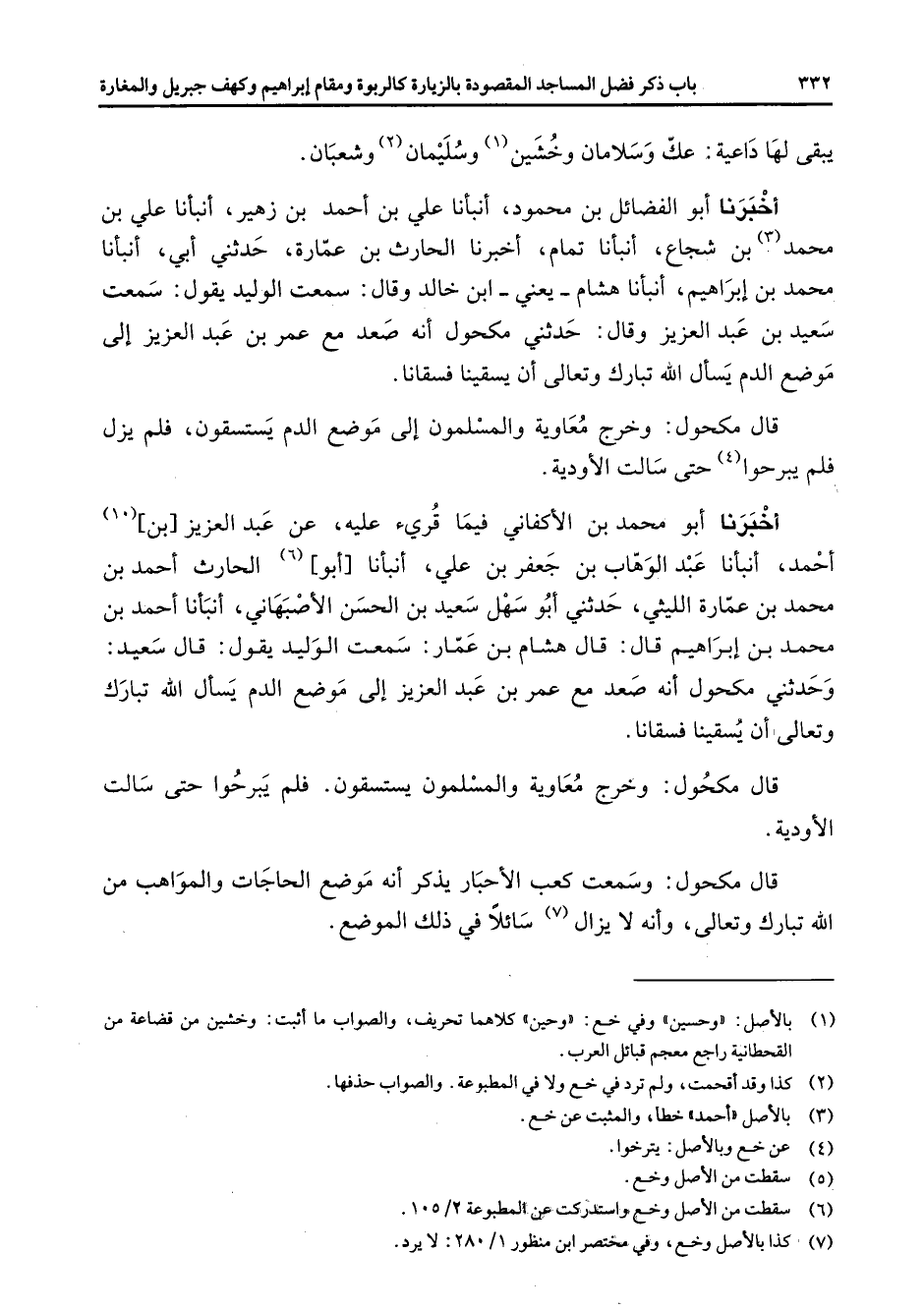 يبقى لها داعية عك وسلامان وخشين (1) وسليمان (2) وشعبان أخبرنا أبو الفضائل بن محمود أنبأنا علي بن أحمد بن زهير أنبأنا علي بن محمد (3) بن شجاع أنبأنا تمام أخبرنا الحارث بن عمارة حدثني أبي أنبأنا محمد بن إبراهيم أنبأنا هشام يعني ابن خالد وقال سمعت الوليد يقول سمعت سعيد بن عبد العزيز وقال حدثني مكحول أنه صعد مع عمر بن عبد العزيز إلى موضع الدم يسأل الله تبارك وتعالى أن يسقينا فسقانا قال مكحول وخرج معاوية والمسلمون إلى موضع الدم يستسقون فلم يزل فلم يبرحوا (4) حتى سالت الأودية أخبرنا أبو محمد بن الأكفاني فيما قرئ عليه عن عبد العزيز بن (5) أحمد أنبأنا عبد الوهاب بن جعفر بن علي أنبأنا أبو (6) الحارث أحمد بن محمد بن عمارة الليثي حدثني أبو سهل سعيد بن الحسن الاصبهاني أنبأنا أحمد بن محمد بن إبراهيم قال قال هشام بن عمار سمعت الوليد يقول قال سعيد وحدثني مكحول أنه صعد مع عمر بن عبد العزيز إلى موضع الدم يسأل الله تبارك وتعالى أن يسقينا فسقانا قال مكحول وخرج معاوية والمسلمون يستسقون فلم يبرحوا حتى سالت الأودية قال مكحول وسمعت كعب الأحبار يذكر أنه موضع الحاجات والمواهب من الله تبارك وتعالى وأنه لا يزال (7) سائلا في ذلك الموضع