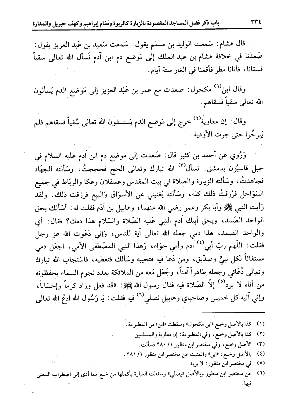 قال هشام سمعت الوليد بن مسلم يقول سمعت سعيد بن عبد العزيز يقول صعدنا في خلافة هشام بن عبد الملك إلى موضع دم ابن آدم نسأل الله تعالى سقيا فسقانا فأتانا مطر فأقمنا في الغار ستة أيام وقال ابن (1) مكحول صعدت مع عمر بن عبد العزيز إلى موضع الدم يسألون الله تعالى سقيا فسقاهم وقال إن معاوية (2) خرج إلى موضع الدم يستسقون الله تعالى سقيا فسقاهم فلم يبرحوا حتى جرت الأودية وروي عن أحمد بن كثير قال صعدت إلى موضع دم ابن آدم عليه السلام في جبل قاسيون بدمشق نسأل (3) الله تبارك وتعالى الحج فحججت وسألته الجهاد فجاهدت وسألته الزيارة والصلاة في بيت المقدس وعسقلان وعكا والرباط في جميع السواحل فرزقت ذلك كله وسألته يغنيني عن الأسواق والبيع فرزقت ذلك ولقد رأيت النبي (صلى الله عليه وسلم) وأبا بكر وعمر Bهما وهابيل بن آدم فقلت له أسألك بحق الواحد الصمد وبحق أبيك آدم النبي عليه الصلاة والسلام هذا دمك فقال أي والواحد الصمد هذا دمي جعله الله تعالى آية للناس وإني دعوت الله عز وجل فقلت اللهم رب أبي (4) آدم وأمي حواء وهذا النبي المصطفى الأمي اجعل دمي مستغاثا لكل نبي وصديق ومن دعا فيه فتجيبه وسألك فتعطيه فاستجاب الله تبارك وتعالى دعائي وجعله طاهرا آمنا وجعل معه من الملائكة بعدد نجوم السماء يحفظونه من أتاه لا يرد (5) إلا الصلاة فيه فقال رسول الله (صلى الله عليه وسلم) قد فعل وزاد كرما وإحسانا وإني آتيه كل خميس وصاحباي وهابيل نصلي (6) فيه فقلت يا رسول الله ادع الله تعالى