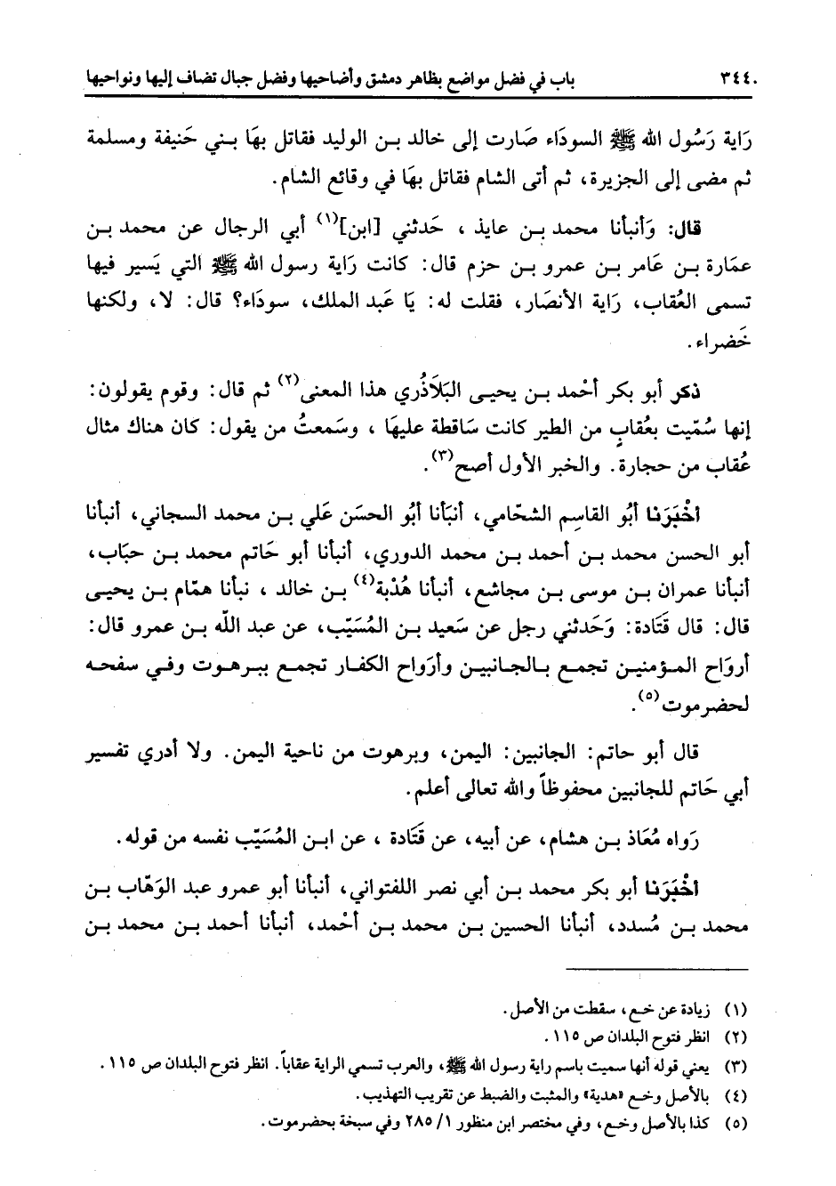 راية رسول الله (صلى الله عليه وسلم) السوداء صارت إلى خالد بن الوليد فقاتل بها بني حنيفة ومسلمة ثم مضى إلى الجزيرة ثم أتى الشام فقاتل بها في وقائع الشام قال وأنبأنا محمد بن عايذ حدثني ابن (1) أبي الرجال عن محمد بن عمارة بن عامر بن عمرو بن حزم قال كانت راية رسول الله (صلى الله عليه وسلم) التي يسير فيها تسمى العقاب راية الأنصار فقلت له يا عبد الملك سوداء قال لا ولكنها خضراء ذكر أبو بكر أحمد بن يحيى البلاذري هذا المعنى (2) ثم قال وقوم يقولون إنها سميت بعقاب من الطير كانت ساقطة عليها وسمعت من يقول كان هناك مثال عقاب من حجارة والخبر الأول أصح (3) أخبرنا أبو القاسم الشحامي أنبأنا أبو الحسن علي بن محمد السجاني أنبأنا أبو الحسن محمد بن أحمد بن محمد الدوري أنبأنا أبو حاتم محمد بن حباب أنبأنا عمران بن موسى بن مجاشع أنبأنا هدبة (4) بن خالد نبأنا همام بن يحيى قال قال قتادة وحدثني رجل عن سعيد بن المسيب عن عبد الله بن عمرو قال أرواح المؤمنين تجمع بالجانبين وأرواح الكفار تجمع ببرهوت وفي سفحه لحضرموت (5) قال أبو حاتم الجانبين اليمن وبرهوت من ناحية اليمن ولا أدري تفسير أبي حاتم للجانبين محفوظا والله تعالى أعلم رواه معاذ بن هشام عن أبيه عن قتادة عن ابن المسيب نفسه من قوله أخبرنا أبو بكر محمد بن أبي نصر اللفتواني أنبأنا أبو عمرو عبد الوهاب بن محمد بن مسدد أنبأنا الحسين بن محمد بن أحمد أنبأنا أحمد بن محمد بن