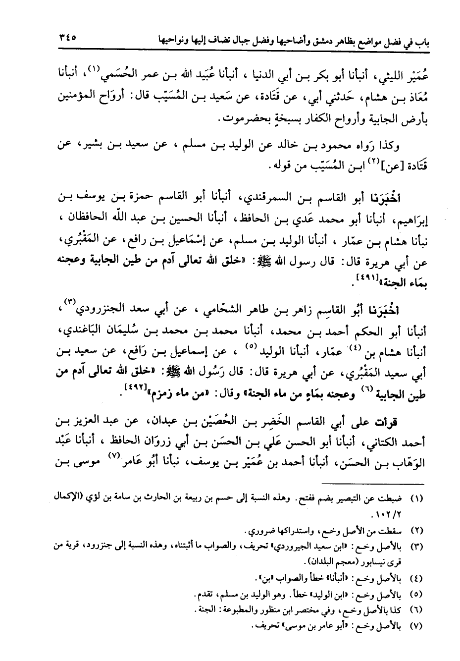 عمير الليثي أنبأنا أبو بكر بن أبي الدنيا أنبأنا عبيد الله بن عمر الحسمي (1) أنبأنا معاذ بن هشام حدثني أبي عن قتادة عن سعيد بن المسيب قال أرواح المؤمنين بأرض الجابية وأرواح الكفار بسبخة بحضرموت وكذا رواه محمود بن خالد عن الوليد بن مسلم عن سعيد بن بشير عن قتادة عن (2) ابن المسيب من قوله أخبرنا أبو القاسم بن السمرقندي أنبأنا أبو القاسم حمزة بن يوسف بن إبراهيم أنبأنا أبو محمد عدي بن الحافظ أنبأنا الحسين بن عبد الله الحافظان نبأنا هشام بن عمار أنبأنا الوليد بن مسلم عن إسماعيل بن رافع عن المقبري عن أبي هريرة قال قال رسول الله (صلى الله عليه وسلم) خلق الله تعالى آدم من طين الجابية وعجنه بماء الجنة