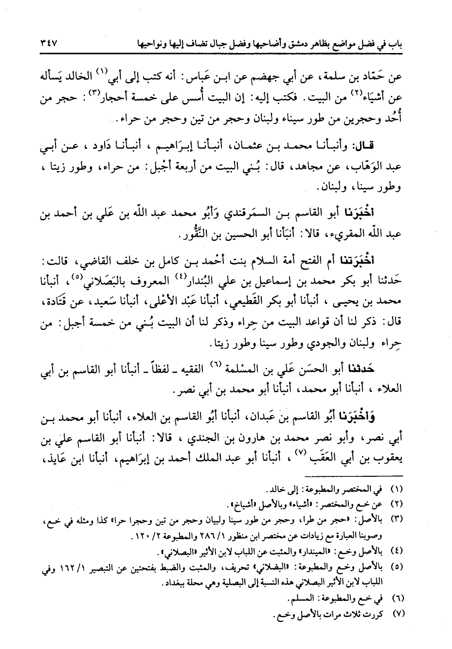 عن حماد بن سلمة عن أبي جهضم عن ابن عباس أنه كتب إلى أبي (1) الخالد يسأله عن أشياء (2) من البيت فكتب إليه إن البيت اسس على خمسة أحجار (3) حجر من أحد وحجرين من طور سيناء ولبنان وحجر من تين وحجر من حراء قال وأنبأنا محمد بن عثمان أنبأنا إبراهيم أنبأنا داود عن أبي عبد الوهاب عن مجاهد قال بني البيت من أربعة أجبل من حراء وطور زيتا وطور سينا ولبنان أخبرنا أبو القاسم بن السمرقندي وأبو محمد عبد الله بن علي بن أحمد بن عبد الله المقرئ قالا أنبأنا أبو الحسين بن النقور أخبرتنا أم الفتح أمة السلام بنت أحمد بن كامل بن خلف القاضي قالت حدثنا أبو بكر محمد بن إسماعيل بن علي البندار (4) المعروف بالبصلاني (5) أنبأنا محمد بن يحيى أنبأنا أبو بكر القطيعي أنبأنا عبد الأعلى أنبأنا سعيد عن قتادة قال ذكر لنا أن قواعد البيت من حراء وذكر لنا أن البيت بني من خمسة أجبل من حراء ولبنان والجودي وطور سينا وطور زيتا حدثنا أبو الحسن علي بن المسلمة (6) الفقيه لفظا أنبأنا أبو القاسم بن أبي العلاء أنبأنا أبو محمد أنبأنا أبو محمد بن أبي نصر وأخبرنا أبو القاسم بن عبدان أنبأنا أبو القاسم بن العلاء أنبأنا أبو محمد بن أبي نصر وأبو نصر محمد بن هارون بن الجندي قالا أنبأنا أبو القاسم علي بن يعقوب بن أبي العقب (7) أنبأنا أبو عبد الملك أحمد بن إبراهيم أنبأنا ابن عايذ