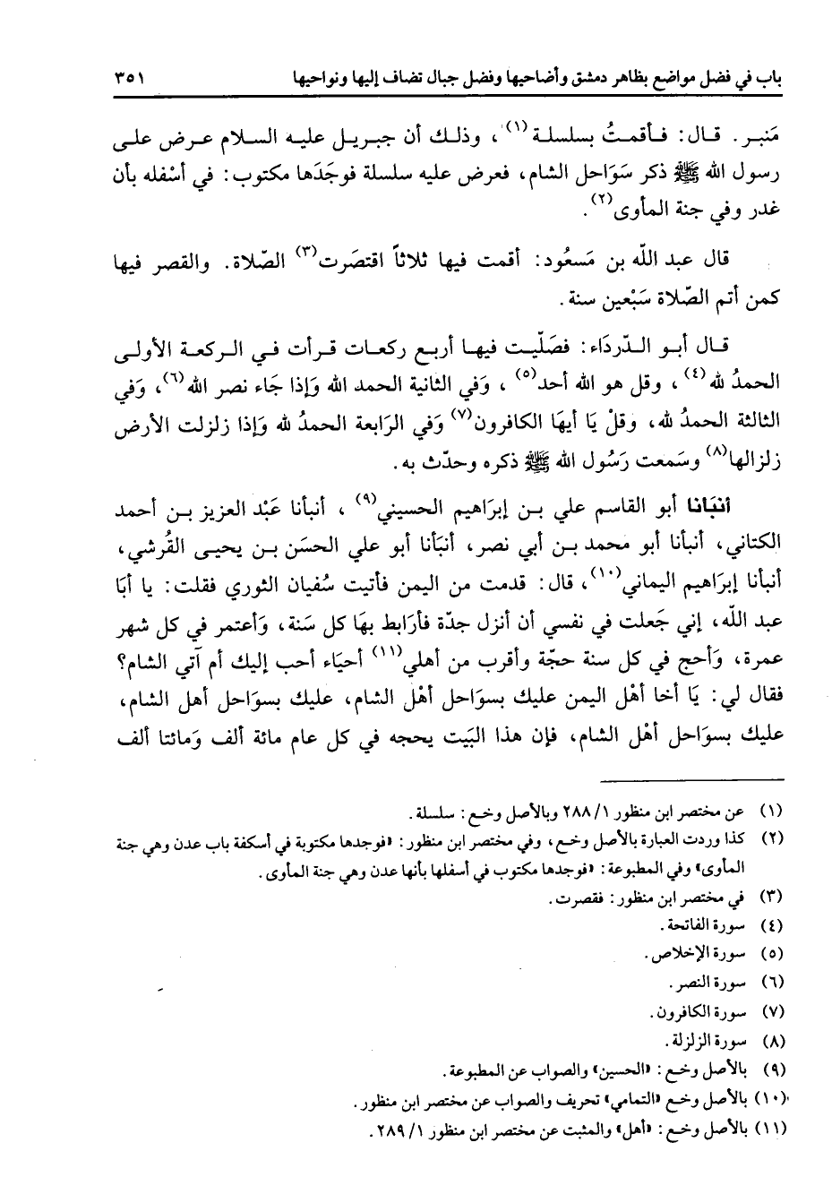 منبر قال فأقمت بسلسلة (1) وذلك أن جبريل عليه السلام عرض على رسول الله (صلى الله عليه وسلم) ذكر سواحل الشام فعرض عليه سلسلة فوجدها مكتوب في أسفله بأن غدر وفي جنة المأوى (2) قال عبد الله بن مسعود أقمت فيها ثلاثا اقتصرت (3) الصلاة والقصر فيها كمن أتم الصلاة سبعين سنة قال أبو الدرداء فصليت فيها أربع ركعات قرأت في الركعة الأولى الحمد لله (4) وقل هو الله أحد (5) وفي الثانية الحمد لله وإذا جاء نصر الله (6) وفي الثالثة الحمد لله وقل يا أيها الكافرون (7) وفي الرابعة الحمد لله وإذا زلزلت الأرض زلزالها (8) وسمعت رسول الله (صلى الله عليه وسلم) ذكره وحدث به أنبأنا أبو القاسم علي بن إبراهيم الحسيني (9) أنبأنا عبد العزيز بن أحمد الكتاني أنبأنا أبو محمد بن أبي نصر أنبأنا أبو علي الحسن بن يحيى القرشي أنبأنا إبراهيم اليماني (10) قال قدمت من اليمن فأتيت سفيان الثوري فقلت يا ابا عبد الله إني جعلت في نفسي أن أنزل جدة فأرابط بها كل سنة وأعتمر في كل شهر عمرة وأحج في كل سنة حجة وأقرب من أهلي (11) أحياء أحب إليك أم آتي الشام فقال لي يا أخا أهل اليمن عليك بسواحل أهل الشام عليك بسواحل أهل الشام عليك بسواحل أهل الشام فإن هذا البيت يحجه في كل عام مائة ألف ومائتا ألف