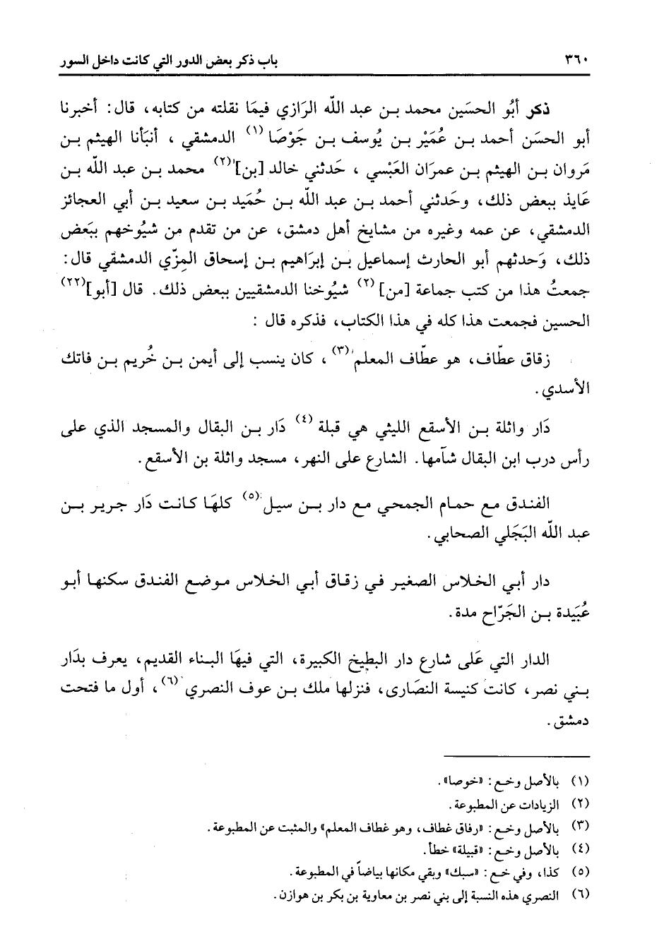 ذكر أبو الحسين محمد بن عبد الله الرازي فيما نقلته من كتابه قال أخبرنا أبو الحسن أحمد بن عمير بن يوسف بن جوصا (1) الدمشقي أنبأنا الهيثم بن مروان بن الهيثم بن عمران العبسي حدثني خالد بن (2) محمد بن عبد الله بن عايذ ببعض ذلك وحدثني أحمد بن عبد الله بن حميد بن سعيد بن أبي العجائز الدمشقي عن عمه وغيره من مشايخ أهل دمشق عن من تقدم من شيوخهم ببعض ذلك وحدثهم أبو الحارث إسماعيل بن إبراهيم بن إسحاق المزي الدمشقي قال جمعت هذا من كتب جماعة من (2) شيوخنا الدمشقيين ببعض ذلك قال أبو (2) الحسين فجمعت هذا كله في هذا الكتاب فذكره قال زقاق عطاف هو عطاف المعلم (3) كان ينسب إلى أيمن بن خريم بن فاتك الأسدي دار واثلة بن الأسقع الليثي هي قبلة (4) دار بن البقال والمسجد الذي على رأس درب ابن البقال شامها الشارع على النهر مسجد واثلة بن الأسقع الفندق مع حمام الجمحي مع دار بن سيل (5) كلها كانت دار جرير بن عبد الله البجلي الصحابي دار أبي الخلاس الصغير في زقاق أبي الخلاس موضع الفندق سكنها أبو عبيدة بن الجراح مدة الدار التي على شارع دار البطيخ الكبيرة التي فيها البناء القديم يعرف بدار بني نصر كانت كنيسة النصارى فنزلها ملك بن عوف النصري (6) أول ما فتحت دمشق