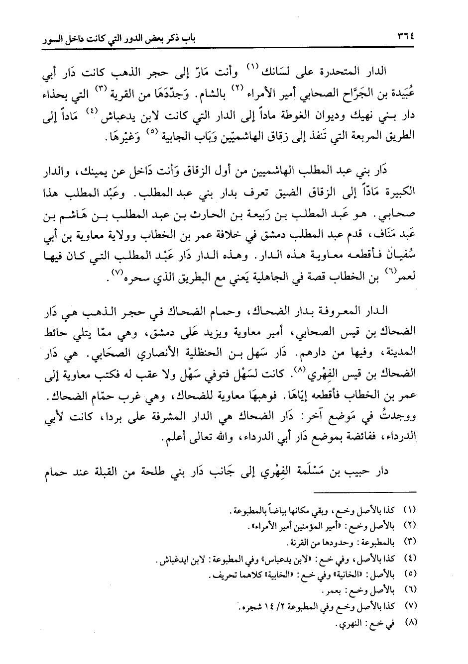 الدار المتحدرة على لسانك (1) وأنت مار إلى حجر الذهب كانت دار أبي عبيدة بن الجراح الصحابي أمير الأمراء (2) بالشام وجددها من القرية (3) التي بحذاء دار بني نهيك وديوان الغوطة مادا إلى الدار التي كانت لابن يدعباش (4) مادا إلى الطريق المربعة التي تنفذ إلى زقاق الهاشميين وباب الجابية (5) وغيرها دار بني عبد المطلب الهاشميين من أول الزقاق وأنت داخل عن يمينك والدار الكبيرة مادا إلى الزقاق الضيق تعرف بدار بني عبد المطلب وعبد المطلب هذا صحابي هو عبد المطلب بن ربيعة بن الحارث بن عبد المطلب بن هاشم بن عبد مناف قدم عبد المطلب دمشق في خلافة عمر بن الخطاب وولاية معاوية بن أبي سفيان فأقطعه معاوية هذه الدار وهذه الدار دار عبد المطلب التي كان فيها لعمر (6) بن الخطاب قصة في الجاهلية يعني مع البطريق الذي سحره (7) الدار المعروفة بدار الضحاك وحمام الضحاك في حجر الذهب هي دار الضحاك بن قيس الصحابي أمير معاوية ويزيد على دمشق وهي مما يتلي حائط المدينة وفيها من دارهم دار رسهل بن الحنظلية الأنصاري الصحابي هي دار الضحاك بن قيس الفهري (8) كانت لسهل فتوفي سهل ولا عقب له فكتب معاوية إلى عمر بن الخطاب فأقطعه إياها فوهبها معاوية للضحاك وهي غرب حمام الضحاك ووجدت في موضع آخر دار الضحاك هي الدار المشرفة على بردا كانت لأبي الدرداء ففائضة بموضع دار أبي الدرداء والله تعالى أعلم دار حبيب بن مسلمة الفهري إلى جانب دار بني طلحة من القبلة عند حمام
