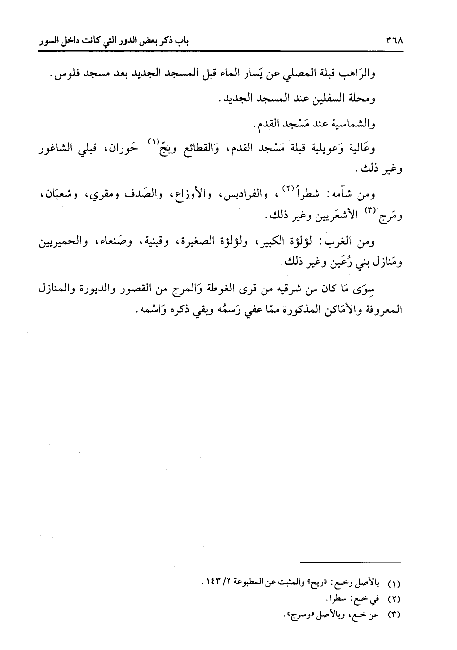 والراهب قبلة المصلي عن يسار الماء قبل المسجد الجديد بعد مسجد فلوس ومحلة السفلين عند المسجد الجديد والشماسية عند مسجد القدم وعالية وعويلية قبلة مسجد القدم والقطائع وبج (1) حوران قبلي الشاغور وغير ذلك ومن شامه شطرا (2) والفراديس والأوزاع والصدف ومقري وشعبان ومرج (3) الأشعريين وغير ذلك ومن الغرب لؤلؤة الكبير ولؤلؤة الصغيرة وقينية وصنعاء والحميريين ومنازل بني رعين وغير ذلك سوى ما كان من شرقيه من قرى الغوطة والمرج من القصور والديورة والمنازل المعروفة والأماكن المذكورة مما عفي رسمه وبقي ذكره واسمه