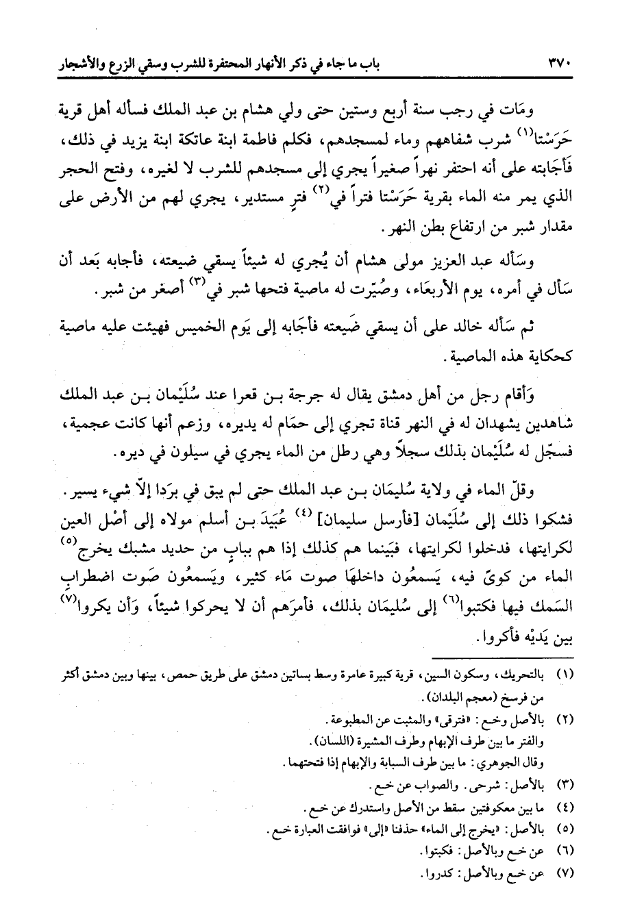 ومات في رجب سنة اربع وستين حتى ولي هشام بن عبد الملك فسأله أهل قرية حرستا (1) شرب شفاههم وماء لمسجدهم فكلم فاطمة ابنة عاتكة ابنة يزيد في ذلك فأجابته على أنه احتفر نهرا صغيرا يجري إلى مسجدهم للشرب لا لغيره وفتح الحجر الذي يمر منه الماء بقرية حرستا فترا في (2) فتر مستدير يجري لهم من الأرض على مقدار شبر من ارتفاع بطن النهر وسأله عبد العزيز مولى هشام أن يجري له شيئا يسقي ضيعته فأجابه بعد أن سأل في أمره يوم الأربعاء وصيرت له ماصية فتحها شبر في (3) أصغر من شبر ثم سأله خالد على أن يسقي ضيعته فأجابه إلى يوم الخميس فهيئت عليه ماصية كحكاية هذه الماصية وأقام رجل من أهل دمشق يقال له جرجة بن قعرا عند سليمان بن عبد الملك شاهدين يشهدان له في النهر قناة تجري إلى حمام له يديره وزعم أنها كانت عجمية فسجل له سليمان بذلك سجلا وهي رطل من الماء يجري في سيلون في ديره وقل الماء في ولاية سليمان بن عبد الملك حتى لم يبق في بردا إلا شئ يسير فشكوا ذلك إلى سليمان فأرسل سليمان (4) عبيد بن اسلم مولاه إلى اصل العين لكرايتها فدخلوا لكرايتها فبينما هم كذلك إذا هم بباب من حديد مشبك يخرج (5) الماء من كوى فيه يسمعون داخلها صوت ماء كثير ويسمعون صوت اضطراب السمك فيها فكتبوا (6) إلى سليمان بذلك فأمرهم أن لا يحركوا شيئا وأن يكروا (7) بين يديه فأكروا