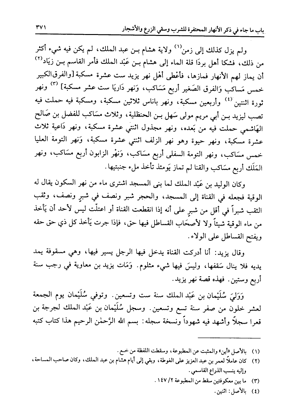 ولم يزل كذلك إلى زمن (1) ولاية هشام بن عبد الملك لم يكن فيه شئ أكثر من ذلك فشكا أهل بردا قلة الماء إلى هشام بن عبد الملك فأمر القاسم بن زياد (2) أن يماز لهم الأنهار فمازها فأعطى أهل نهر يزيد ست عشرة مسكبة والفرق الكبير خمس مساكب والفرق الصغير أربع مساكب ونهر داريا ست عشر مسكبة (3) ونهر ثورة اثنتين (4) وأربعين مسكبة ونهر باناس ثلاثين مسكبة ومسكبة فيه حملت فيه تصب ليزيد بن أبي مريم مولى سهل بن الحنظلية وثلاث مساكب للفضل بن صالح الهاشمي حملت فيه من بعده ونهر مجذول اثنتي عشرة مسكبة ونهر داعية ثلاث عشرة مسكبة ونهر حيوة وهو نهر الزلف اثنتي عشرة مسكبة ونهر التومة العليا خمس مساكب ونهر التومة السفلى أربع مساكب ونهر الزابون اربع مساكب ونهر الملك أربع مساكب والقنا لم تماز يومئذ تأخذ ملء جنبتيها وكان الوليد بن عبد الملك لما بنى المسجد اشترى ماء من نهر السكون يقال له الوقية فجعله في القناة إلى المسجد والحجر شبر ونصف في شبر ونصف وثقب الثقب شبرا في أقل من شبر على أنه إذا انقطعت القناة أو اعتلت ليس لأحد أن يأخذ من ماء الوقية شيئا ولا لأصحاب القساطل فيها حق فإذا جرت يأخذ كل ذي حق حقه ويفتح القساطل على الولاء وقال يزيد أنا أدركت القناة يدخل فيها الرجل يسير فيها وهي مسقوفة يمد يديه فلا ينال سقفها وليس فيها شئ مثلوم ومات يزيد بن معاوية في رجب سنة أربع وستين فهذه قصة نهر يزيد وولي سليمان بن عبد الملك سنة ست وتسعين وتوفي سليمان يوم الجمعة لعشر خلون من صفر سنة تسع وتسعين وسجل سليمان بن عبد الملك لجرجة بن قعرا سجلا واشهد فيه شهودا ونسخة سجله بسم الله الرحمن الرحيم هذا كتاب كتبه