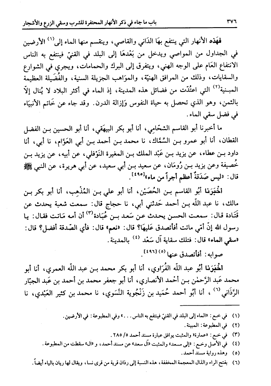 خمس وعشرين ومائة فهذه الأنهار التي ينتفع بها الداني والقاصي وينقسم منها الماء إلى (1) الأرضين في الجداول من المواصي ويدخل من بعدها إلى البلد في القني فينتفع به الناس الانتفاع العام على الوجه الهني ويتفرق إلى البرك والحمامات ويجري في الشوارع والسقايات وذلك من المرافق الهنية والمواهب الجزيلة السنية والفضيلة العظيمة المبنية (2) التي اعتدت من فضائل هذه المدينة إذ الماء في أكثر البلاد لا ينال إلا بالثمن وهو الذي تحصل به حياة النفوس وإزالة الدرن وقد جاء عن خاتم الأنبياء في فضل سقي الماء ما أخبرنا أبو القاسم الشحامي أنا أبو بكر البيهقي أنا أبو الحسين بن الفضل القطان أنا أبو عمرو بن السماك نا محمد بن أحمد بن أبي العوام نا أبي أنا داود بن عطاء عن يزيد بن عبد الملك بن المغيرة النوفلي عن أبيه عن يزيد بن خصيفة وعن يزيد بن رومان عن سعيد بن ابي سعيد عن أبي هريرة عن النبي (صلى الله عليه وسلم) قال ليس صدقة أعظم أجرا من ماء