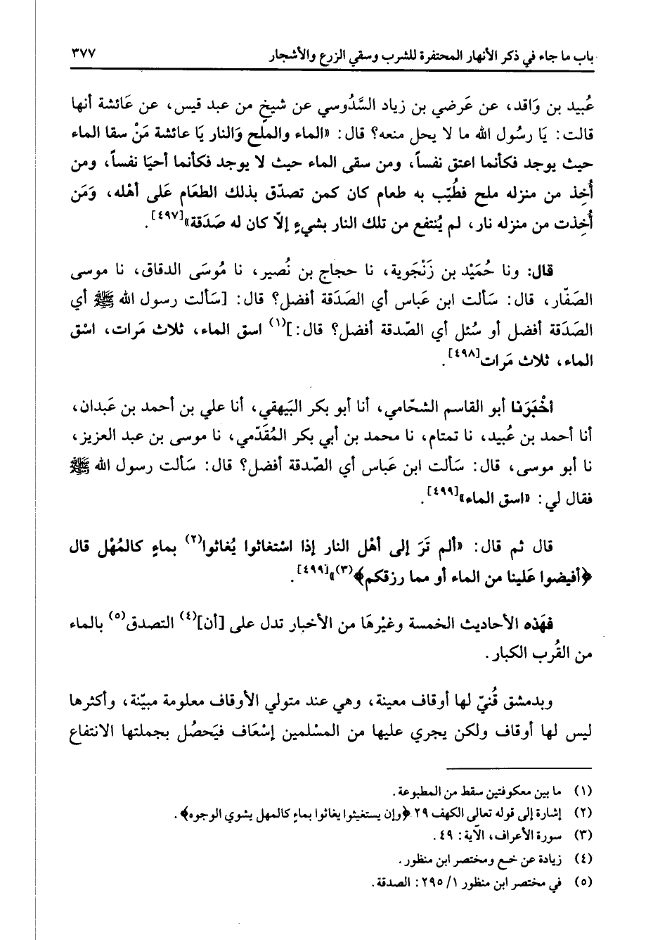[499] فهذه الأحاديث الخمسة وغيرها من الأخبار تدل على أن (4) التصدق (5) بالماء من القرب الكبار وبدمشق قني لها أوقاف معينة وهي عند متولي الأوقاف معلومة مبينة وأكثرها ليس لها أوقاف ولكن يجري عليها من المسلمين إسعاف فيحصل بجملتها الانتفاع