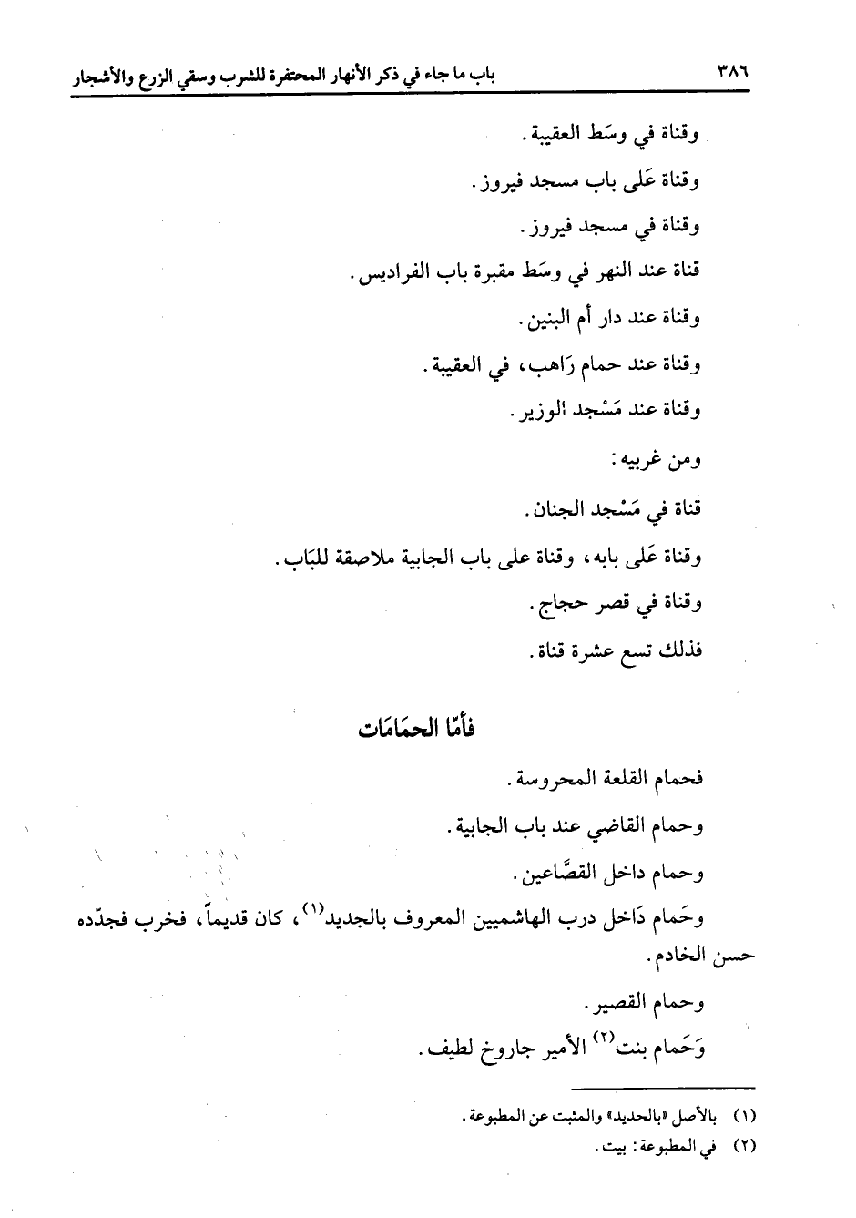 وقناة في وسط العقيبة وقناة على باب مسجد فيروز وقناة في مسجد فيروز قناة عند النهر في وسط مقبرة باب الفراديس وقناة عند دار أم البنين وقناة عند حمام راهب في العقيبة وقناة عند مسجد الوزير ومن غربيه قناة في مسجد الجنان وقناة على بابه وقناة على باب الجابية ملاصقة للباب وقناة في قصر حجاج فذلك تسع عشرة قناة فأما الحمامات فحمام القلعة المحروسة وحمام القاضي عند باب الجابية وحمام داخل القصاعين وحمام داخل درب الهاشميين المعروف بالجديد (1) كان قديما فخرب فجدده حسن الخادم وحمام القصير وحمام بنت (2) الأمير جاروخ لطيف