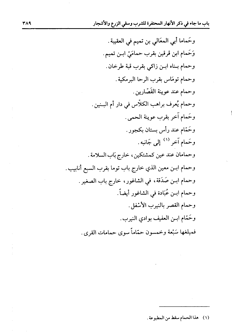 وحماما أبي المعالي بن تميم في العقيبة وحمام ابن قرقين بقرب حمامي ابن تميم وحمام بناه ابن زاكي بقرب قبة طرخان وحمام توماس بقرب الرحا البرمكية وحمام عند عوينة القصارين وحمام يعرف براهب الكلاس في دار أم البنين وحمام آخر بقرب عوينة الحمى وحمام عند رأس بستان بكجور وحمام آخر (1) إلى جانبه وحمامان عند عين كمشتكين خارج باب السلامة وحمام ابن معين الذي خارج باب توما بقرب السبع أنابيب وحمام ابن صدقة في الشاغور خارج باب الصغير وحمام ابن عبادة في الشاغور أيضا وحمام القصر بالنيرب الأسفل وحمام ابن العفيف بوادي النيرب فمبلغها سبعة وخمسون حماما سوى حمامات القرى