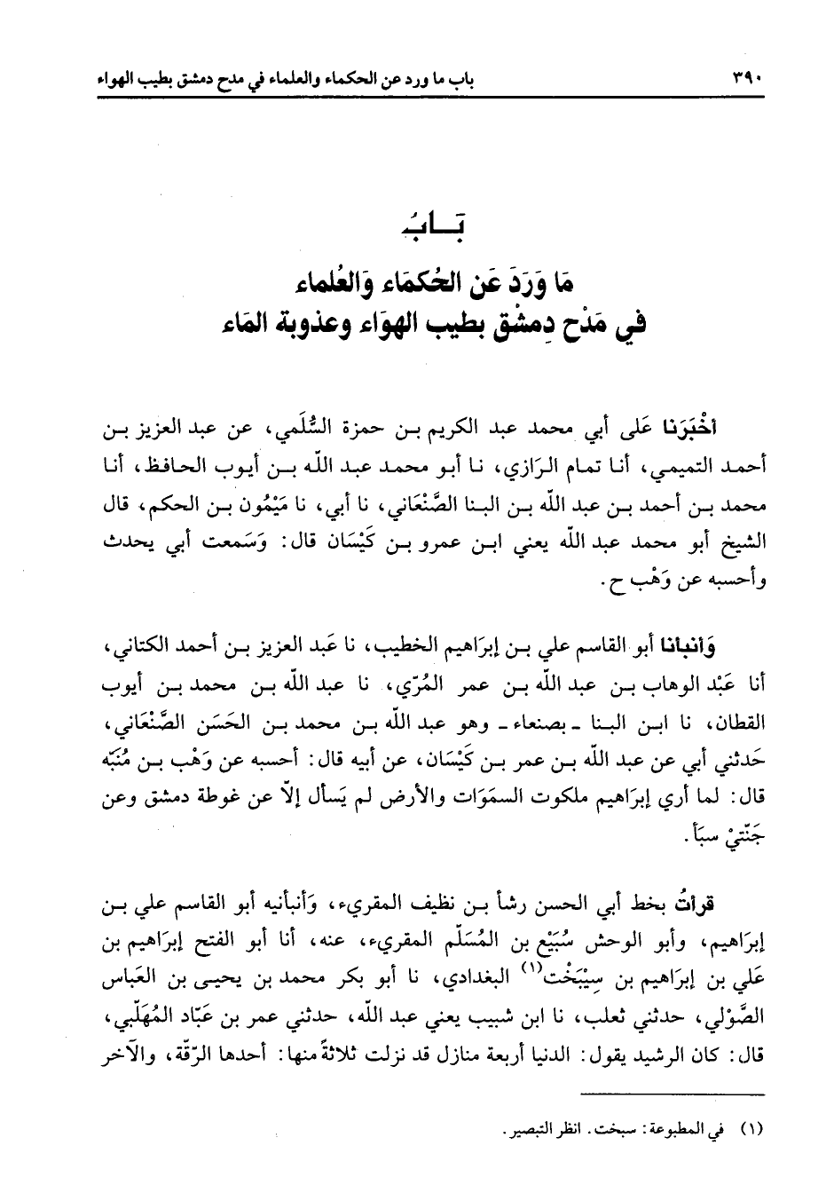 " باب ما ورد عن الحكماء والعلماء في مدح دمشق بطيب الهواء وعذوبة الماء " أخبرنا علي أبي محمد عبد الكريم بن حمزة السلمي عن عبد العزيز بن أحمد التميمي أنا تمام الرازي نا أبو محمد عبد الله بن ايوب الحافظ أنا محمد بن أحمد بن عبد الله بن البنا الصنعاني نا أبي نا ميمون بن الحكم قال الشيخ أبو محمد عبد الله يعني ابن عمرو بن كيسان قال وسمعت أبي يحدث وأحسبه عن وهب وأنبأنا أبو القاسم علي بن إبراهيم الخطيب نا عبد العزيز بن أحمد الكتاني انا عبد الوهاب بن عبد الله بن عمر المري نا عبد الله بن محمد بن أيوب القطان نا ابن البنا بصنعاء وهو عبد الله بن محمد بن الحسن الصنعاني حدثني أبي عن عبد الله بن عمر بن كيسان عن أبيه قال أحسبه عن وهب بن منبه قال لما أري إبراهيم ملكوت السموات والأرض لم يسأل إلا عن غوطة دمشق وعن جنتي سبأ قرأت بخط أبي الحسن رشأ بن نظيف المقرئ وأنبأنيه أبو القاسم علي بن إبراهيم وأبو الوحش سبيع بن المسلم المقرئ عنه أنا أبو الفتح إبراهيم بن علي بن إبراهيم بن سيبخت (1) البغدادي نا أبو بكر محمد بن يحيى بن العباس الصولي حدثني ثعلب نا ابن شبيب يعني عبد الله حدثني عمر بن عباد المهلبي قال كان الرشيد يقول الدنيا أربعة منازل قد نزلت ثلاثة منها أحدها الرقة والآخر