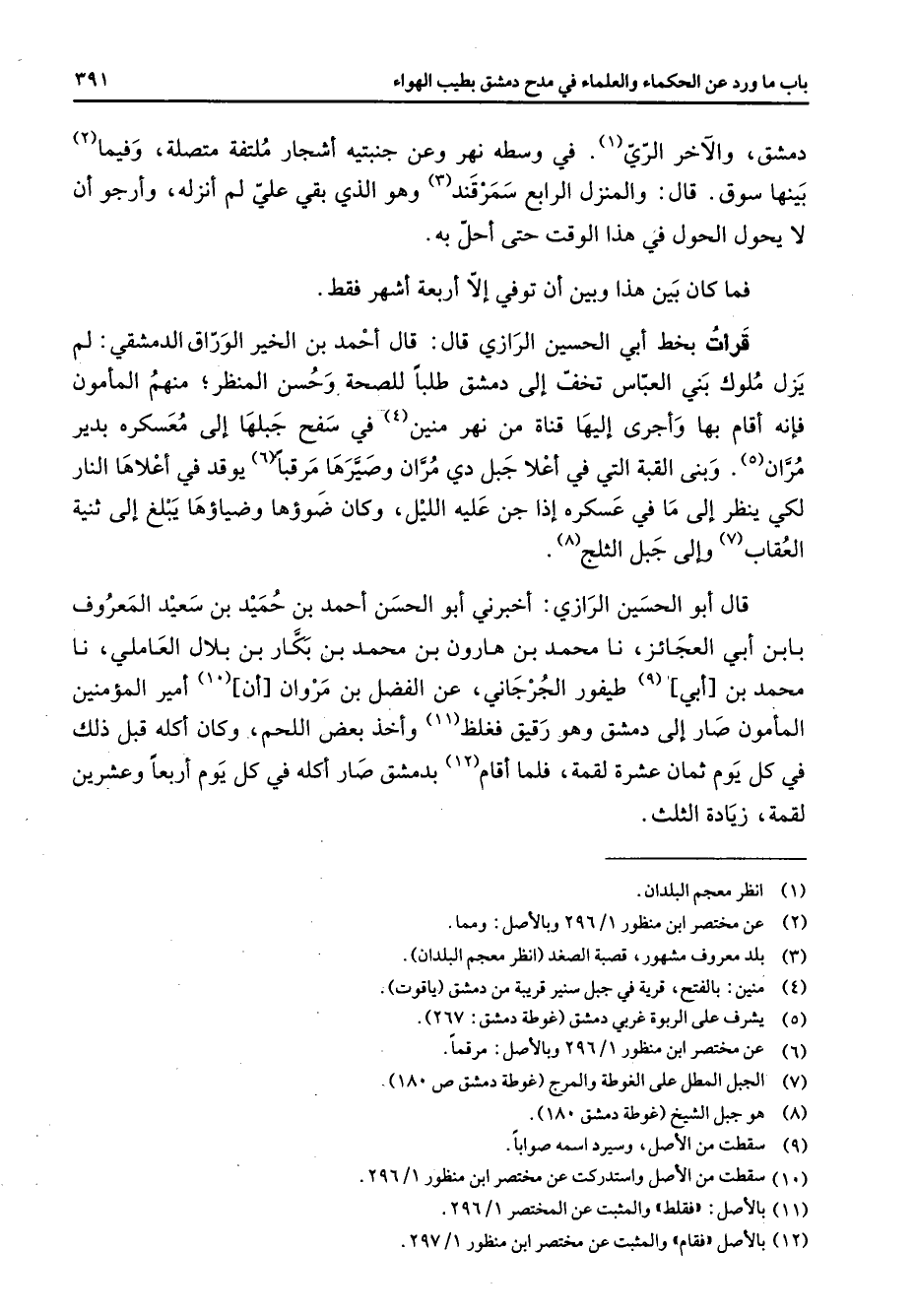 دمشق والآخر الري (1) في وسطه نهر وعن جنبتيه اشجار ملتفة متصلة وفيما (2) بينها سوق قال والمنزل الرابع سمرقند (3) وهو الذي بقي علي لم أنزله وأرجو أن لا يحول الحول في هذا الوقت حتى أحل به فما كان بين هذا وبين أن توفي إلا أربعة اشهر فقط قرأت بخط أبي الحسين الرازي قال قال أحمد بن الخير الوراق الدمشقي لم يزل ملوك بني العباس تخف إلى دمشق طلبا للصحة وحسن المنظر منهم المأمون فإنه أقام بها وأجرى إليها قناة من نهر منين (4) في سفح جبلها إلى معسكره بدير مران (5) وبنى القبة التي في أعلا جبل دي مران وصيرها مرقبا (6) يوقد في أعلاها النار لكي ينظر إلى ما في عسكره إذا جن عليه الليل وكان ضوؤها وضياؤها يبلغ إلى ثنية العقاب (7) وإلى جبل الثلج (8) قال أبو الحسين الرازي أخبرني أبو الحسن أحمد بن حميد بن سعيد المعروف بابن أبي العجائز نا محمد بن هارون بن محمد بن بكار بن بلال العاملي نا محمد بن أبي (9) طيفور الجرجاني عن الفضل بن مروان أن (10) أمير المؤمنين المأمون صار إلى دمشق وهو رقيق فغلظ (11) وأخذ بعض اللحم وكان أكله قبل ذلك في كل يوم ثمان عشرة لقمة فلما اقام (12) بدمشق صار أكله في كل يوم أربعا وعشرين لقمة زيادة الثلث
