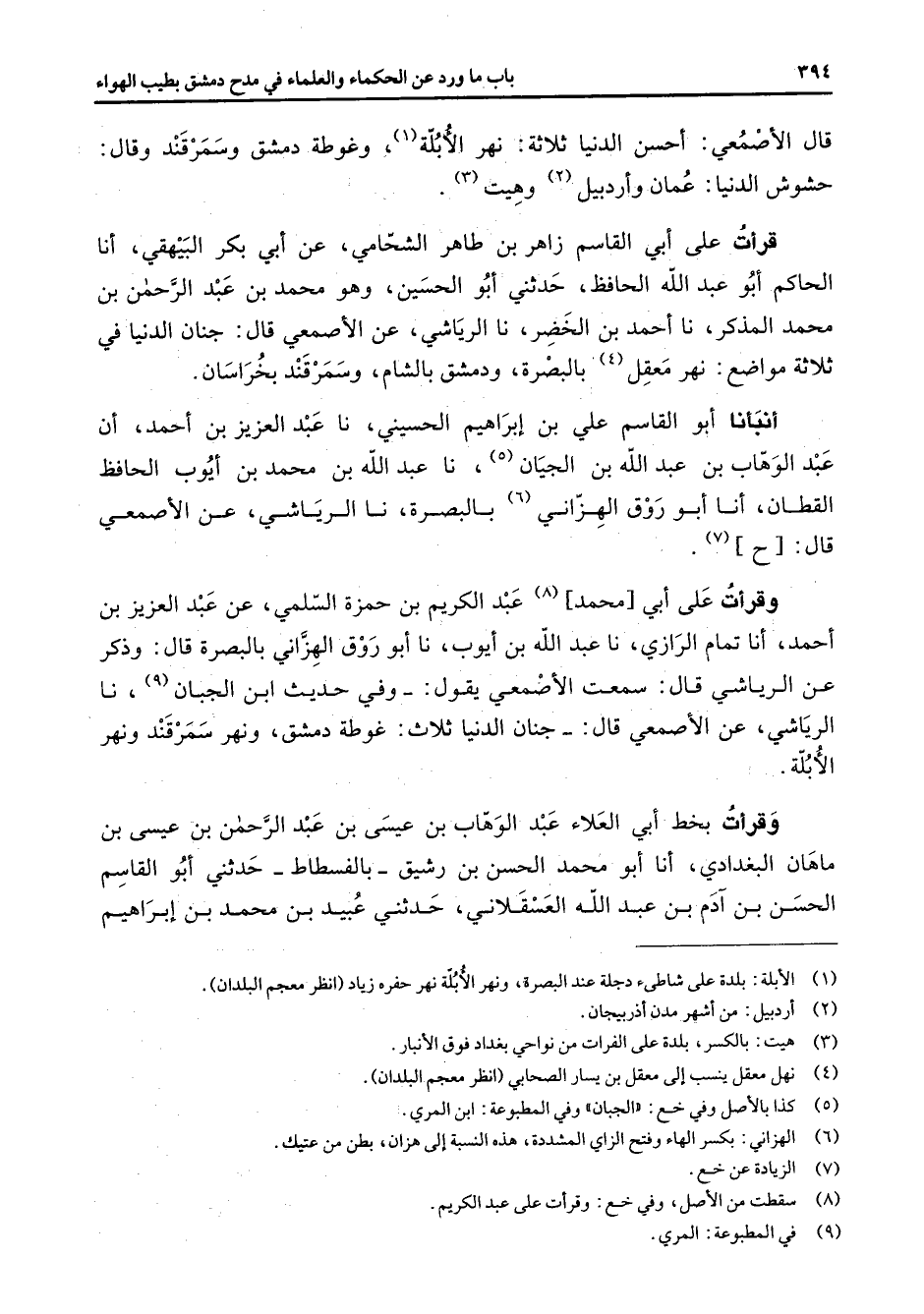 قال الاصمعي أحسن الدنيا ثلاثة نهر الأبلة (1) وغوطة دمشق وسمرقند وقال حشوش الدنيا عمان وأردبيل (2) وهيت (3) قرأت على أبي القاسم زاهر بن طاهر الشحامي عن أبي بكر البيهقي أنا الحاكم أبو عبد الله الحافظ حدثني أبو الحسين وهو محمد بن عبد الرحمن بن محمد المذكر نا أحمد بن الخضر نا الرياشي عن الأصمعي قال جنان الدنيا في ثلاثة مواضع نهر معقل (4) بالبصرة ودمشق بالشام وسمرقند بخراسان أنبأنا أبو القاسم علي بن إبراهيم الحسيني نا عبد العزيز بن أحمد أن عبد الوهاب بن عبد الله بن الجيان (5) نا عبد الله بن محمد بن ايوب الحافظ القطان أنا أبو روق الهزاني (6) بالبصرة نا الرياشي عن الأصمعي قال ح (7) وقرأت على أبي محمد (8) عبد الكريم بن حمزة السلمي عن عبد العزيز بن أحمد أنا تمام الرازي نا عبد الله بن أيوب نا أبو روق الهزاني بالبصرة قال وذكر عن الرياشي قال سمعت الأصمعي يقول وفي حديث ابن الجبان (9) نا الرياشي عن الأصمعي قال جنان الدنيا ثلاث غوطة دمشق ونهر سمرقند ونهر الأبلة وقرأت بخط أبي العلاء عبد الوهاب بن عيسى بن عبد الرحمن بن عيسى بن ماهان البغدادي أنا أبو محمد الحسن بن رشيق بالفسطاط حدثني أبو القاسم الحسن بن آدم بن عبد الله العسقلاني حدثني عبيد بن محمد بن إبراهيم