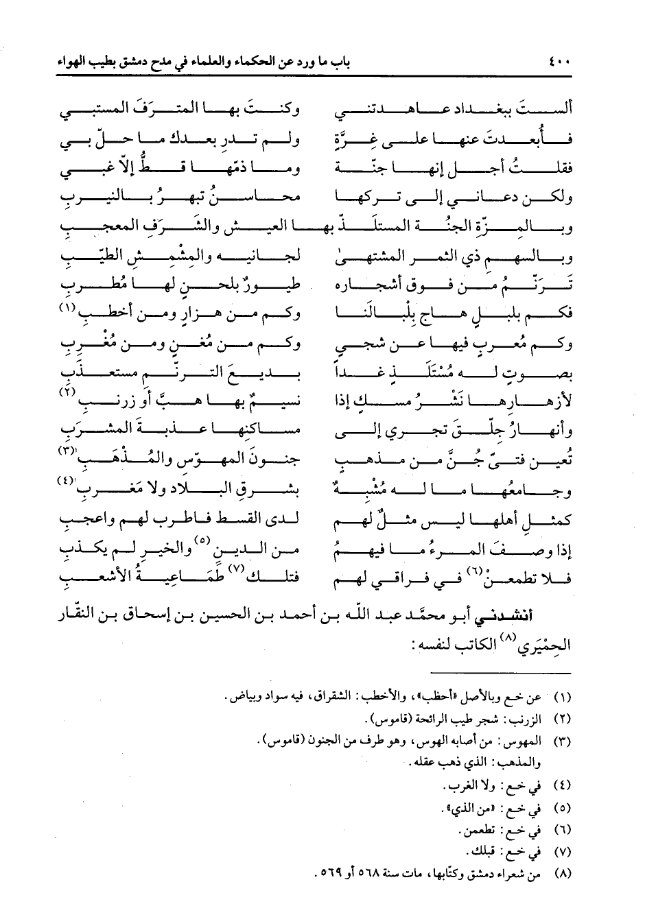 ألست ببغداد عاهدتني * وكنت بها المترف المستبي فأبعدت عنها على غرة * ولم تدر بعدك ما حل بي فقلت أجل إنها جنة * وما ذمها قط إلا غبي ولكن دعاني إلى تركها * محاسن تبهر بالنيرب وبالمزة الجنة المستلذ بها العيش والشرف المعجب وبالسهم ذي الثمر المشتهى * لجانيه والمشمش الطيب ترنم من فوق أشجاره * طيور بلحن لها مطرب فكم بلبل هاج بلبالنا * وكم من هزار ومن أخطب (1) وكم معرب فيها عن شجى * وكم من مغن ومن مغرب بصوت له مستلذ غدا * بديع الترنم مستعذب لأزهارها نشر مسك إذا * نسيم بها هب أو زرنب (2) وأنهار جلق تجري إلى * مساكنها عذبة المشرب تعين فتى جن من مذهب * جنون المهوس والمذهب (3) وجامعها ما له مشبه * بشرق البلاد ولا مغرب (4) كمثل أهلها ليس مثل لهم * لدى القسط فأطرب لهم واعجب إذا وصف المرء ما فيهم * من الدين (5) والخير لكم يكذب فلا تطمعن (6) في فراقي لهم * فتلك (7) طماعية الأشعب أنشدني أبو محمد عبد الله بن أحمد بن الحسين بن إسحاق بن النقار الحميري (8) الكاتب لنفسه: