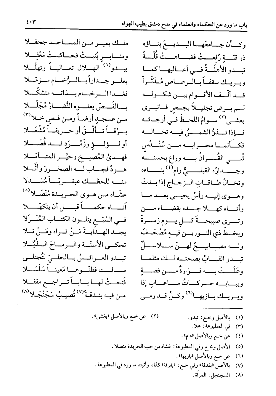 وكأن جامعها البديع بناؤه * ملك يمير من المساجد جحفلا ذو قبة رفعت فضاهت قلة * ومنابر بنيت فحاكت معقلا تبدو الأهلة في أعاليها كما * يبدو (1) الهلال تعاليا وتهللا ويريك سقفا بالرصاص مدثرا * يعلو جدارا بالرخام مزملا قد الف الأقوام بين شكوله * فغدا الرخام بذاته متشكلا لم يرض تجليلا بجص فانبرى * بالفص يعلوه النضار مجللا يعشى (2) سوام اللحظ في أرجائه * من عسجد أرضا ومن فص خلا (3) فإذا تذر الشمس فيه تخاله * برقا تألق أو حريقا مشعلا فكأنما محرابه من سندس * أو لؤلؤ وزمرد قد فصلا تلي القران به وراع بحسنه * فهدى المصيخ وحير المتأملا وجداره القبلي رام (4) بناءه * هود فجاب له الصخور وأثلا وتخال طاقات الزجاج إذا بدت * منه للحظك عبقريا مسدلا وهوى إليه رأس يحيى بعد ما * عشاه من هوى الجريدة منصلا (5) وأتاه كهلا جده بقضاء من * آتاه حكما قبل أن يتكهلا وترى صبيحة كل يوم زمرة * في السبع يتلون الكتاب المنزلا وبخط ذي النورين فيه مصحف * يجد الهداية من قراه ومن تلا وله مصابيح لهن سلاسل * تحكي الأسنة والرماح الذبلا تبدو القباب بصحنه لك مثلما * تبدو العرائس بالحلي لتجتلى وعلت به فوارة من فضة * سالت فظنوها معينا سلسلا وببابه حركات ساعات إذا * فتحت لها بابا تراجع مقفلا ويريك بازيها (6) وكل قد رمى * من فيه بندقة (7) تصيب سجنجلا (8)