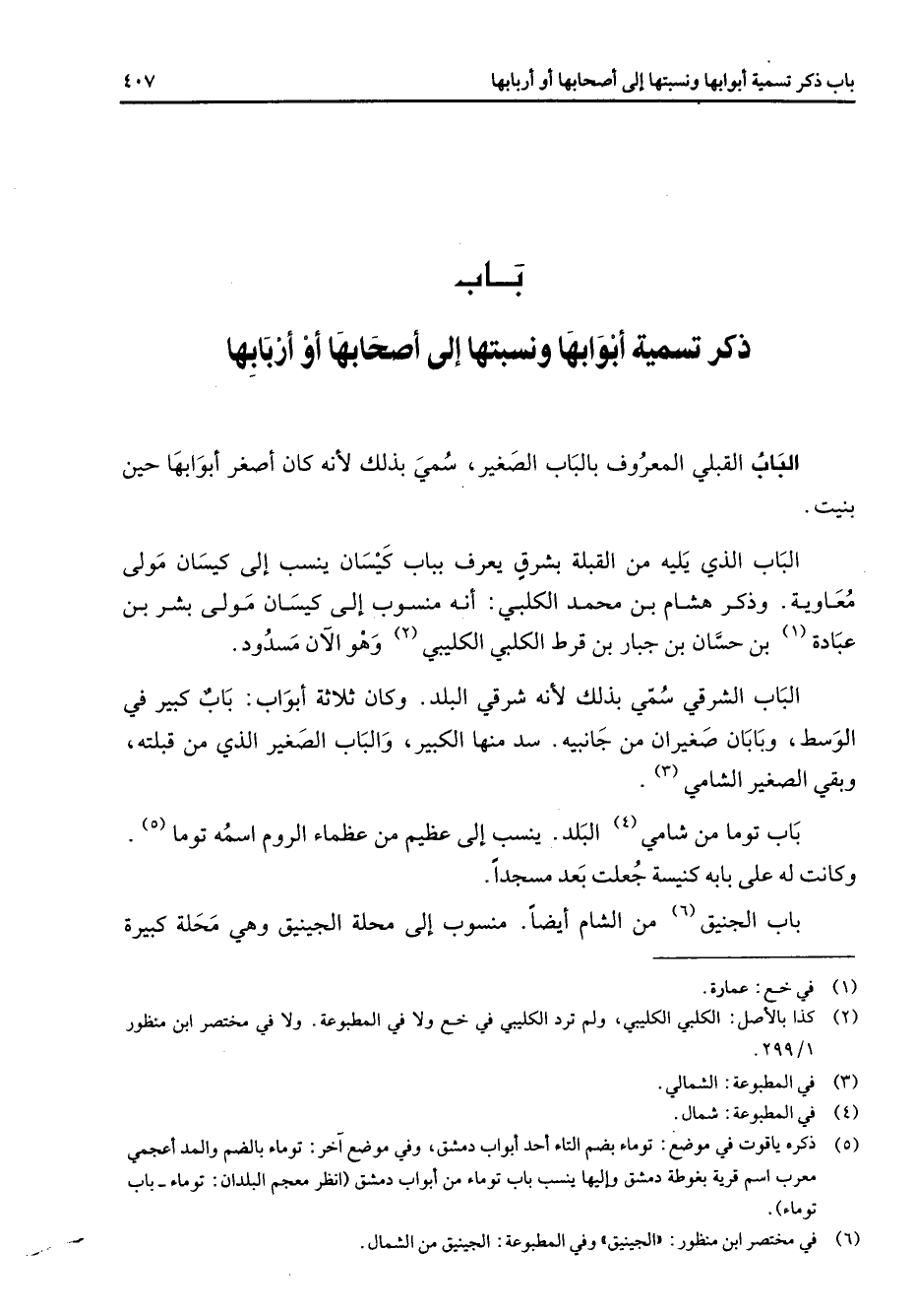" باب ذكر تسمية أبوابها ونسبتها إلى أصحابها أو اربابها " الباب القبلي المعروف بالباب الصغير سمي بذلك لأنه كان أصغر أبوابها حين بنيت الباب الذي يليه من القبلة بشرق يعرف بباب كيسان ينسب إلى كيسان مولى معاوية وذكر هشام بن محمد الكلبي أنه منسوب إلى كيسان مولى بشر بن عبادة (1) بن حسان بن جبار بن قرط الكلبي الكليبي (2) وهو الآن مسدود الباب الشرقي سمي بذلك لأنه شرقي البلد وكان ثلاثة أبواب باب كبير في الوسط وبابان صغيران من جانبيه سد منها الكبير والباب الصغير الذي من قبلته وبقي الصغير الشامي (3) باب توما من شامي (4) البلد ينسب إلى عظيم من عظماء الروم اسمه توما (5) وكانت له على بابه كنيسة جعلت بعد مسجدا باب الجنيق (6) من الشام أيضا منسوب إلى محلة الجينيق وهي محلة كبيرة