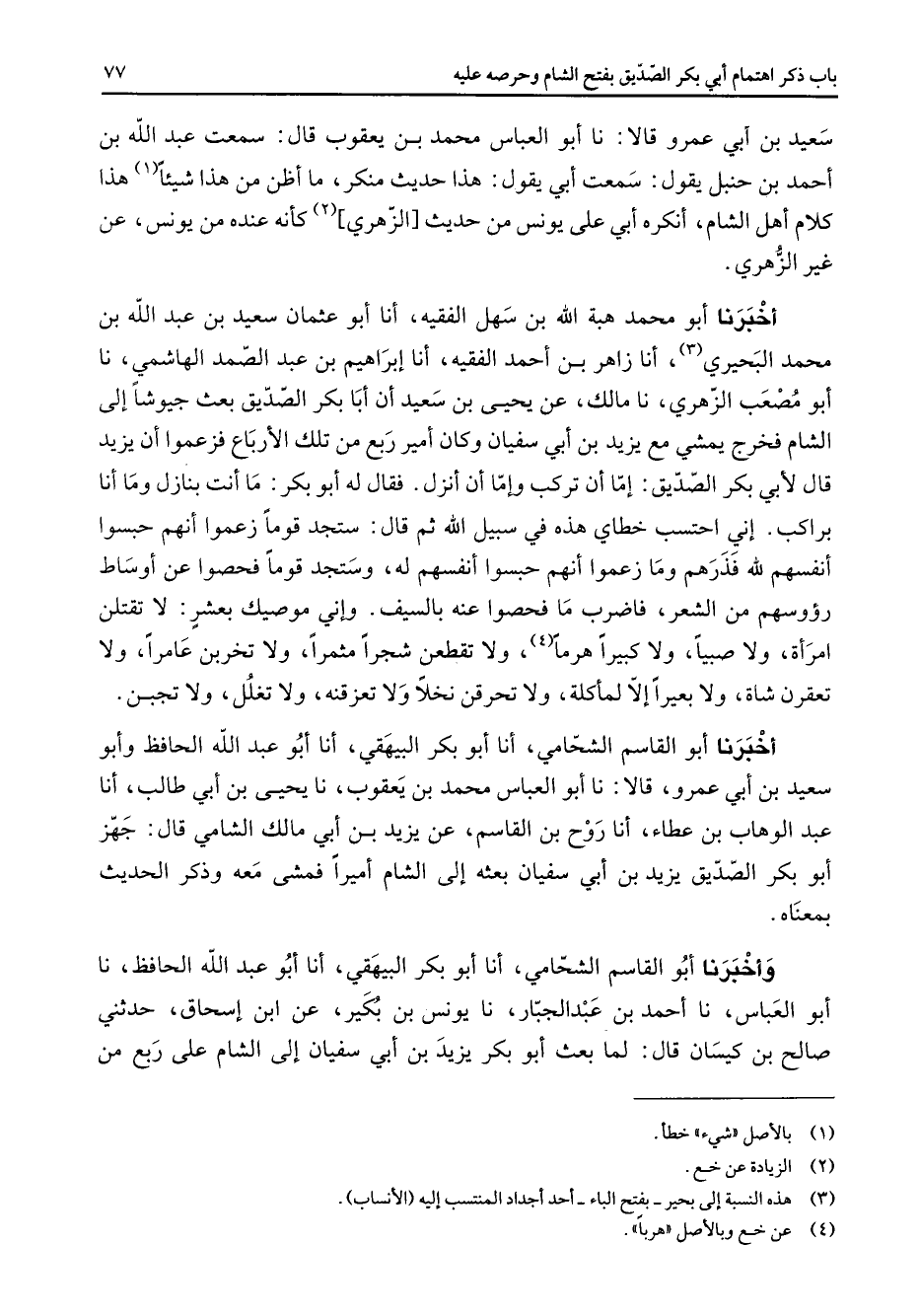 سعيد بن أبي عمرو قالا نا أبو العباس محمد بن يعقبوب قال سمعت عبد الله بن أحمد بن حنبل يقول سمعت أبي يقول هذا حديث منكر ما أظن من هذا شيئا (1) هذا كلام أهل الشام أنكره أبي على يونس من حديث الزهري (2) كأنه عنده من يونس عن غير الزهري أخبرنا أبو محمد هبة الله بن سهل الفقيه أنا أبو عثمان سعيد بن عبد الله بن محمد البحيري (3) أنا زاهر بن أحمد الفقيه أنا إبراهيم بن عبد الصمد الهاشمي نا أبو مصعب الزهري نا مالك عن يحيى بن سعيد أن أبا بكر الصديق بعث جيوشا إلى الشام فخرج يمشي مع يزيد بن أبي سفيان وكان أمير ربع من تلك الأرباع فزعموا أن يزيد قال لأبي بكر الصديق إما أن تركب وإما أن أنزل فقال له أبو بكر ما أنت بنازل وما أنا براكب إني احتسب خطاي هذه في سبيل الله ثم قال ستجد قوما زعموا أنهم حبسوا أنفسهم لله فذرهم وما زعموا أنهم حبسوا أنفسهم له وستجد قوما فحصوا عن أوساط رؤوسهم من الشعر فاضرب ما فحصوا عنه بالسيف وإني موصيك بعشر لا تقتلن امرأة ولا صبيا ولا كبيرا هرما (4) ولا تقطعن شجرا مثمرا ولا تخربن عامرا ولا تعقرن شاة ولا بعيرا إلا لمأكلة ولا تحرقن نخلا ولا تعزقنه ولا تغلل ولا تجبن أخبرنا أبو القاسم الشحامي أنا أبو بكر البيهقي أنا أبو عبد الله الحافظ وأبو سعيد بن أبي عمرو قالا نا أبو العباس محمد بن يعقوب نا يحيى بن أبي طالب أنا عبد الوهاب بن عطاء أنا روح بن القاسم عن يزيد بن أبي مالك الشامي قال جهز أبو بكر الصديق يزيد بن أبي سفيان بعثه إلى الشام أميرا فمشى معه وذكر الحديث بمعناه وأخبرنا أبو القاسم الشحامي أنا أبو بكر البيهقي أنا أبو عبد الله الحافظ نا أبو العباس نا أحمد بن عبد الجبار نا يونس بن بكير عن ابن إسحاق حدثني صالح بن كيسان قال لما بعث أبو بكر يزيد بن أبي سفيان إلى الشام على ربع من