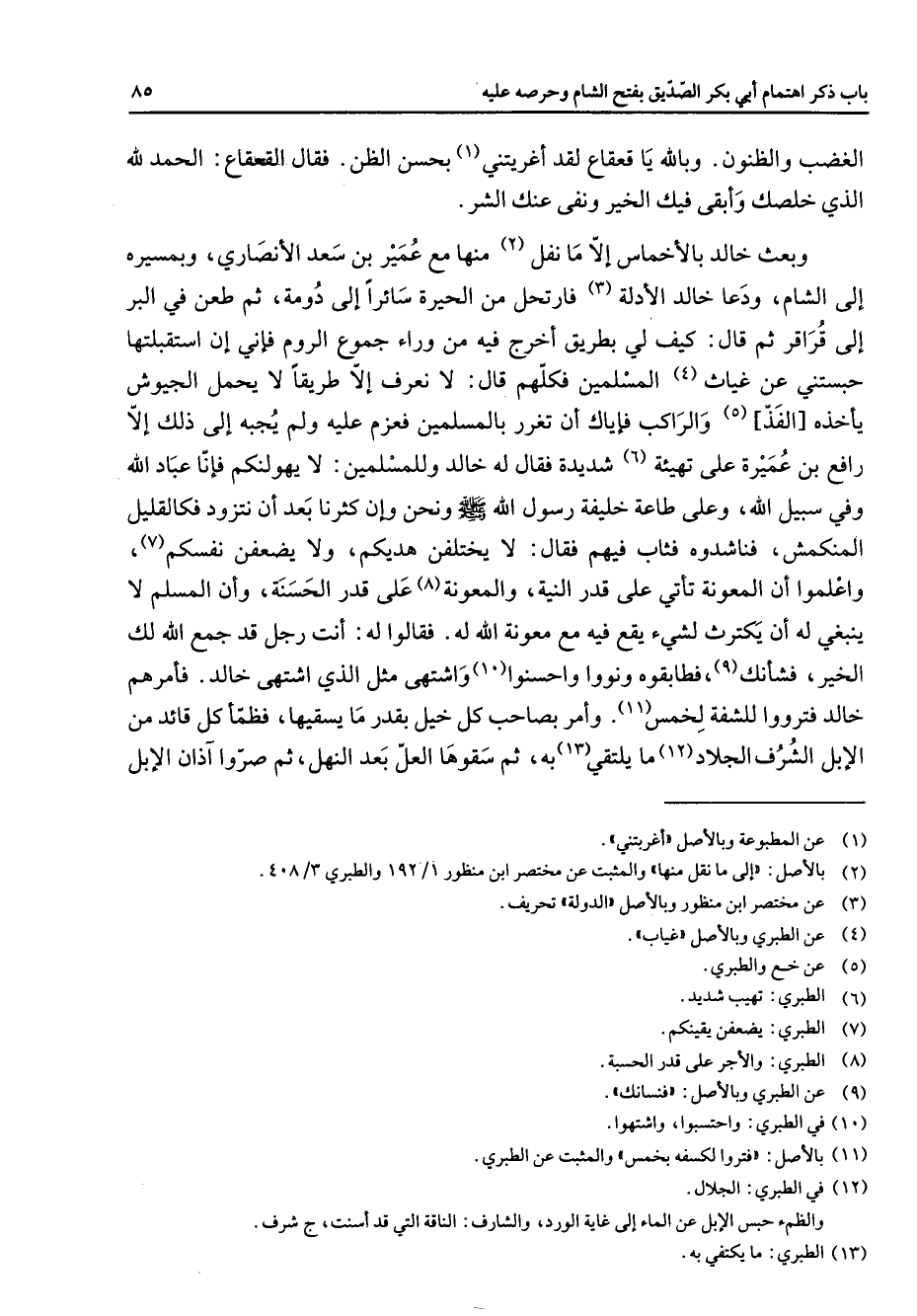الغضب والظنون وبالله يا قعقاع لقد أغريتني (1) بحسن الظن فقال القعقاع الحمد لله الذي خلصك وأبقى فيك الخير ونفى عنك الشر وبعث خالد بالأخماس إلا ما نفل (2) منها مع عمير بن سعد الأنصاري وبمسيره إلى الشام ودعا خالد الأدلة (3) فارتحل من الحيرة سائرا إلى دومة ثم طعن في البر إلى قراقر ثم قال كيف لي بطريق أخرج فيه من وراء جموع الروم فإني إن استقبلتها حبستني عن غياث (4) المسلمين فكلهم قال لا نعرف إلا طريقا لا يحمل الجيوش يأخذه الفذ (5) والراكب فإياك أن تغرر بالمسلمين فعزم عليه ولم يجبه إلى ذلك إلا رافع بن عميرة على تهيئة (6) شديدة فقال له خالد وللمسلمين لا يهولنكم فإنا عباد الله وفي سبيل الله وعلى طاعة خليفة رسول الله (صلى الله عليه وسلم) ونحن وإن كثرنا بعد أن نتزود فكالقليل المنكمش فناشدوه فثاب فيهم فقال لا يختلفن هديكم ولا يضعفن نفسكم (7) واعلموا أن المعونة تأتي على قدر النية والمعونة (8) على قدر الحسنة وأن المسلم لا ينبغي له أن يكترث لشئ يقع فيه مع معونة الله له فقالوا له أنت رجل قد جمع الله لك الخير فشأنك (9) فطابقوه ونووا واحسنوا (10) واشتهى مثل الذي اشتهى خالد فأمرهم خالد فترووا للشفة لخمس (11) وأمر بصاحب كل خيل بقدر ما يسقيها فظمأ كل قائد من الإبل الشرف الجلاد (12) ما يلتقي (13) به ثم سقوها العل بعد النهل ثم صروا آذان الإبل