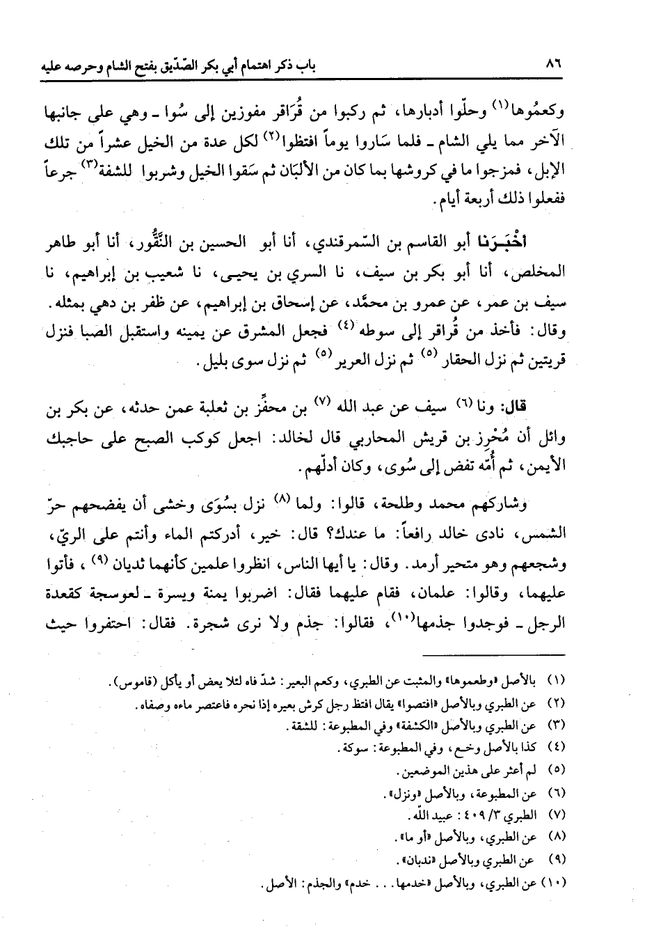 وكعموها (1) وحلوا أدبارها ثم ركبوا من قراقر مفوزين إلى سوا وهي على جانبها الآخر مما يلي الشام فلما ساروا يوما افتظوا (2) لكل عدة من الخيل عشرا من تلك الإبل فمزجوا ما في كروشها بما كان من الألبان ثم سقوا الخيل وشربوا للشفة (3) جرعا ففعلوا ذلك أربعة أيام أخبرنا أبو القاسم بن السمرقندي أنا أبو الحسين بن النقور أنا أبو طاهر المخلص أنا أبو بكر بن سيف نا السري بن يحيى نا شعيب بن إبراهيم نا سيف بن عمر عن عمرو بن محمد عن إسحاق بن إبراهيم عن ظفر بن دهي بمثله وقال فأخذ من قراقر إلى سوطه (4) فجعل المشرق عن يمينه واستقبل الصبا فنزل قريتين ثم نزل الحقار (5) ثم نزل العرير (5) ثم نزل سوى بليل قال ونا (6) سيف عن عبد الله (7) بن محفز بن ثعلبة عمن حدثه عن بكر بن وائل أن محرز بن قريش المحاربي قال لخالد اجعل كوكب الصبح على حاجبك الأيمن ثم أمه تفض إلى سوى وكان أدلهم وشاركهم محمد وطلحة قالوا ولما (8) نزل بسوى وخشي أن يفضحهم حر الشمس نادى خالد رافعا ما عندك قال خير أدركتم الماء وأنتم على الري وشجعهم وهو متحير أرمد وقال يا أيها الناس انظروا علمين كأنهما ثديان (9) فأتوا عليهما وقالوا علمان فقام عليهما فقال اضربوا يمنة ويسرة لعوسجة كقعدة الرجل فوجدوا جذمها (10) فقالوا جذم ولا نرى شجرة فقال احتفروا حيث