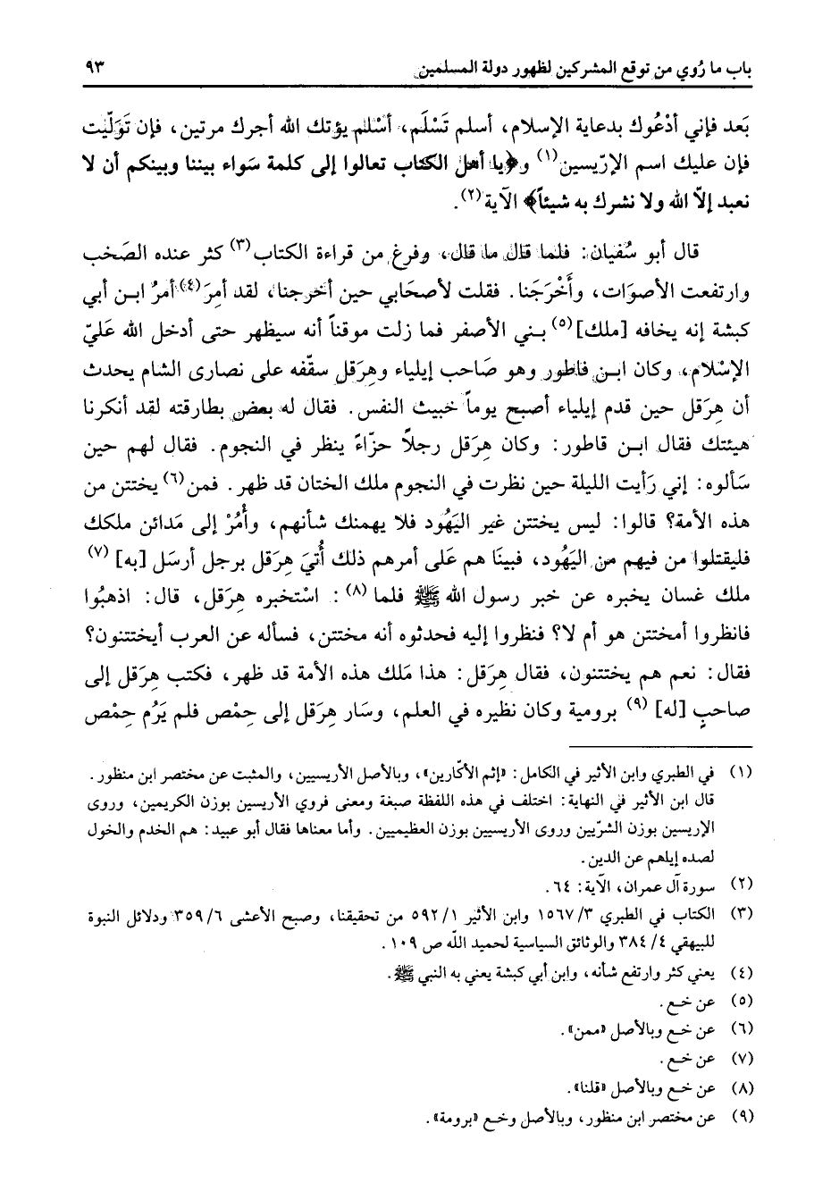 بعد فإني أدعوك بدعاية الإسلام أسلم تسلم أسلم يؤتك الله أجرك مرتين فإن توليت فإن عليك اسم الإريسين (1) و " يا أهل الكتاب تعالوا إلى كلمة سواء بيننا وبينكم أن لا نعبد إلا الله ولا نشرك به شيئا " الآية (2) قال أبو سفيان فلما قال ما قال وفرغ من قراءة الكتاب (3) كثر عنده الصخب وارتفعت الأصوات وأخرجنا فقلت لأصحابي حين أخرجنا لقد أمر (4) أمر ابن أبي كبشة إنه يخافه ملك (5) بني الأصفر فما زلت موقنا أنه سيظهر حتى أدخل الله علي الإسلام وكان ابن فاطور وهو صاحب إيلياء وهرقل سقفه على نصارى الشام يحدث أن هرقل حين قدم إيلياء أصبح يوما خبيث النفس فقال له بعض بطارقته لقد أنكرنا هيئتك فقال ابن قاطور وكان هرقل رجلا حزاء ينظر في النجوم فقال لهم حين سألوه إني رأيت الليلة حين نظرت في النجوم ملك الختان قد ظهر فمن (6) يختتن من هذه الأمة قالوا ليس يختتن غير اليهود فلا يهمنك شأنهم وأمر إلى مدائن ملكك فليقتلوا من فيهم من اليهود فبينا هم على أمرهم ذلك أتي هرقل برجل أرسل به (7) ملك غسان يخبره عن خبر رسول الله (صلى الله عليه وسلم) فلما (8) استخبره هرقل قال اذهبوا فانظروا أمختتن هو أم لا فنظروا إليه فحدثوه أنه مختتن فسأله عن العرب أيختتنون فقال نعم هم يختتنون فقال هرقل هذا ملك هذه الأمة قد ظهر فكتب هرقل إلى صاحب له (9) برومية وكان نظيره في العلم وسار هرقل إلى حمص فلم يرم حمص