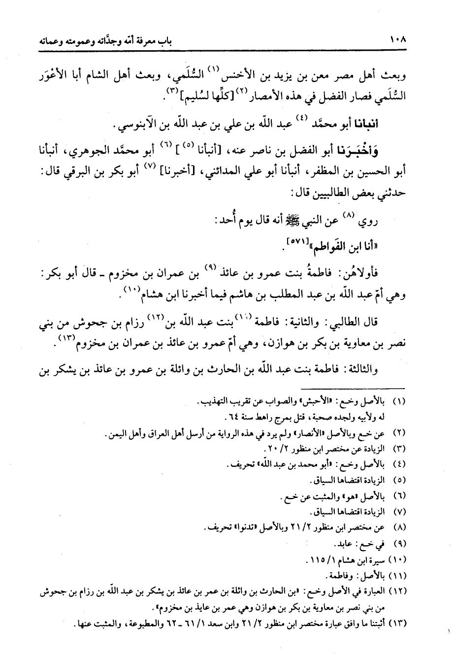 [571] فأولاهن فاطمة بنت عمرو بن عائذ (9) بن عمران بن مخزوم قال أبو بكر وهي أم عبد الله بن عبد المطلب بن هاشم فيما أخبرنا ابن هشام (10) قال الطالبي والثانية فاطمة (11) بنت عبد الله بن (12) رزام بن جحوش من بني نصر بن معاوية بن بكر بن هوازن وهي أم عمرو بن عائذ بن عمران بن مخزوم (13) والثالثة فاطمة بنت عبد الله بن الحارث بن وائلة بن عمرو بن عائذ بن يشكر بن