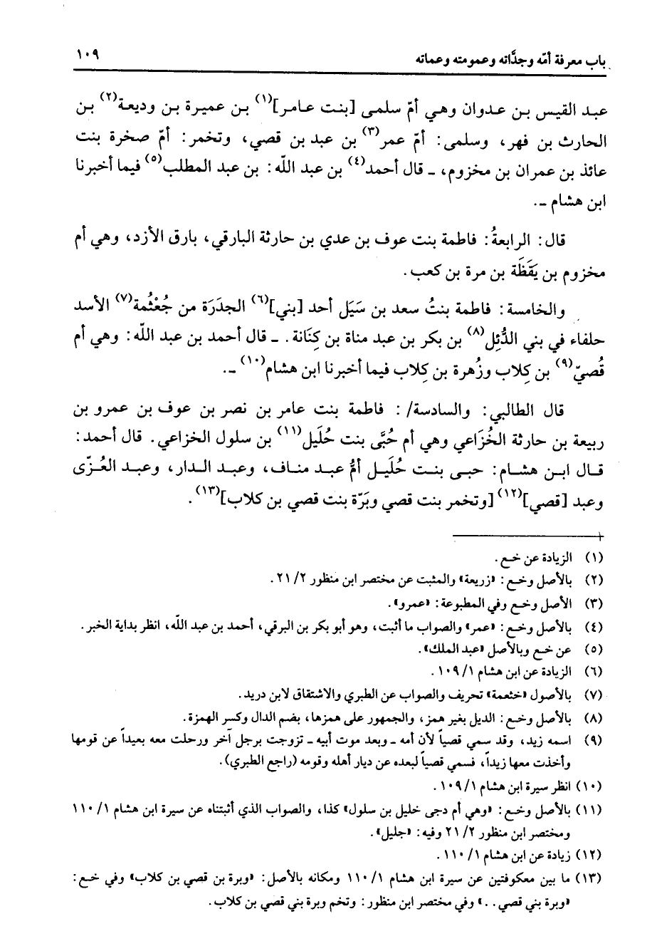 (13) ما بين معكوفتين عن سيرة ابن هشام 1 / 110 ومكانه بالاصل: " وبرة بن قصي بن كلاب " وفي خع: " وبرة بني قصي