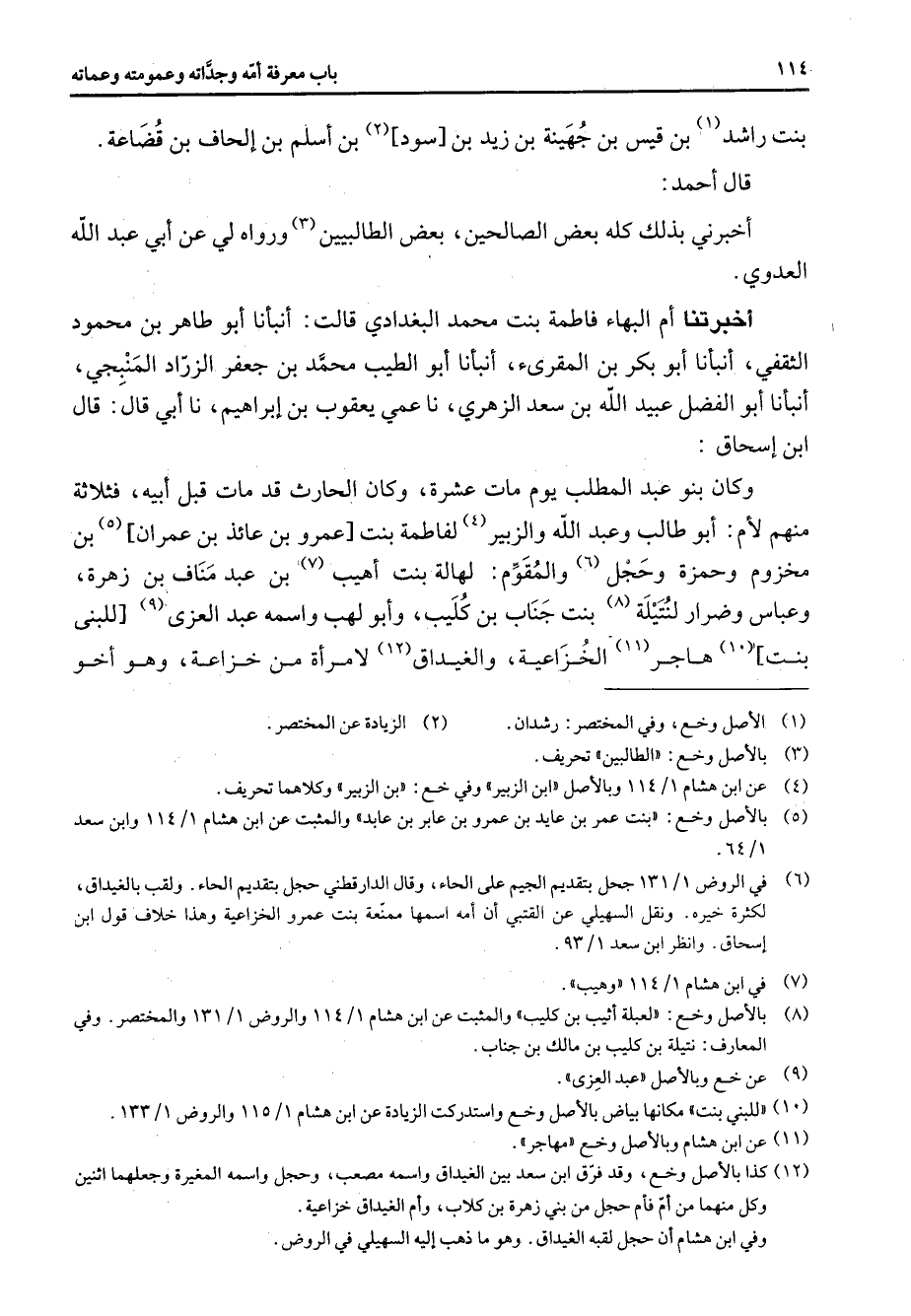 بنت راشد (1) بن قيس بن جهينة بن زيد بن أسود (2) بن أسلم بن إلحاف بن قضاعة قال أحمد أخبرني بذلك كله بعض الصالحين بعض الطالبيين (3) ورواه لي عن أبي عبد الله العدوي أخبرتنا أم البهاء فاطمة بنت محمد البغدادي قالت أنبأنا أبو طاهر بن محمود الثقفي أنبأنا أبو بكر بن المقرئ أنبأنا أبو الطيب محمد بن جعفر الزراد المنبجي أنبأنا أبو الفضل عبيد الله بن سعد الزهري نا عمي يعقوب بن إبراهيم نا أبي قال قال ابن إسحاق وكان بنو عبد المطلب يوم مات عشرة وكان الحارث قد مات قبل أبيه فثلاثة منهم لأم أبو طالب وعبد الله والزبير (4) لفاطمة بنت عمرو بن عائذ بن عمران (5) بن مخزوم وحمزة وحجل (6) والمقوم لهالة بنت أهيب (7) بن عبد مناف بن زهرة وعباس وضرار لنتيلة (8) بنت جناب بن كليب وأبو لهب واسمه عبد العزى (9) للبنى بنت (10) هاجر (11) الخزاعية والغيداق (13) لامرأة من خزاعة وهو أخو