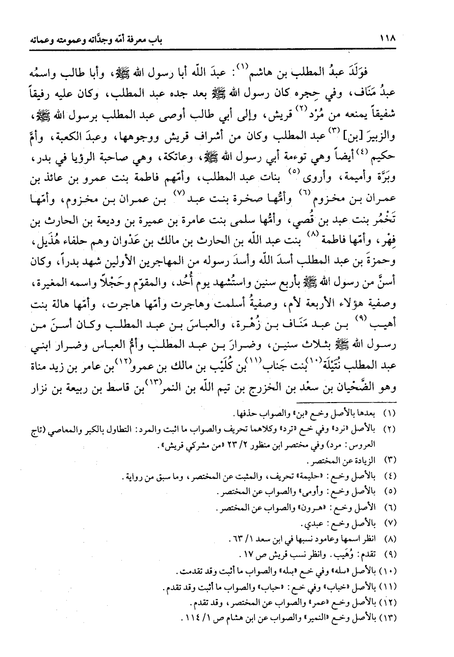 فولد عبد المطلب بن هاشم (1) عبد الله أبا رسول الله (صلى الله عليه وسلم) وأبا طالب واسمه عبد مناف وفي حجره كان رسول الله (صلى الله عليه وسلم) بعد جده عبد المطلب وكان عليه رفيقا شفيقا يمنعه من مرد (2) قريش وإلى أبي طالب أوصى عبد المطلب برسول الله (صلى الله عليه وسلم) والزبير بن (3) عبد المطلب وكان من أشراف قريش ووجوهها وعبد الكعبة وأم حكيم (4) أيضا وهي توءمة أبي رسول الله (صلى الله عليه وسلم) وعاتكة وهي صاحبة بالرؤيا في بدر وبرة وأميمة وأروى (5) بنات عبد المطلب وأمهم فاطمة بنت عمرو بن عائذ بن عمران بن مخزوم (6) وأمها صخرة بنت عبد (7) بن عمران بن مخزوم وأمها تخمر بنت عبد بن قصي وأمها سلمى بنت عامرة بن عميرة بن وديعة بن الحارث بن فهر وأمها فاطمة (8) بنت عبد الله بن الحارث بن مالك بن عدوان وهم حلفاء هذيل وحمزة بن عبد المطلب أسد الله وأسد رسوله من المهاجرين الأولين شهد بدرا وكان أسن من رسول الله (صلى الله عليه وسلم) بأربع سنين واستشهد يوم أحد والمقوم وحجلا واسمه المغيرة وصفية هؤلاء الأربعة لأم وصفية أسلمت وهاجرت وأمها هاجرت وأمها هالة بنت أهيب (9) بن عبد مناف بن زهرة والعباس بن عبد المطلب كان أسن من رسول الله (صلى الله عليه وسلم) بثلاث سنين وضرار بن عبد المطلب وأم العباس وضرار ابني عبد المطلب نتيلة (10) بنت جناب (11) بن كليب بن مالك بن عمرو (12) بن عامر بن زيد مناة وهو الضحيان بن سعد بن الخزرج بن تيم الله بن النمر (13) بن قاسط بن ربيعة بن نزار