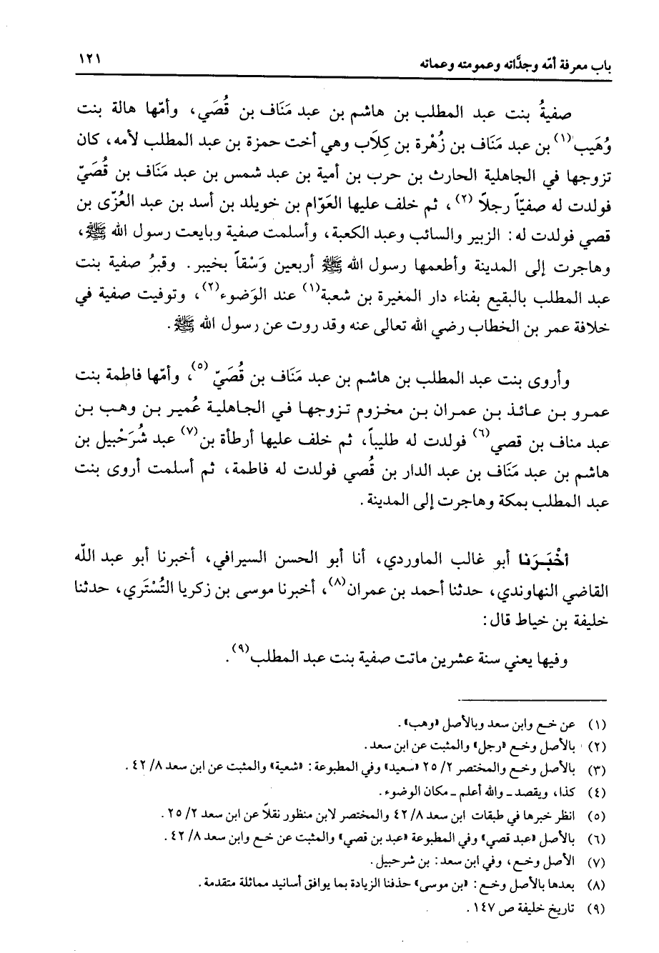 صفية بنت عبد المطلب بن هشام بن عبد مناف بن قصي وأمها هالة بنت وهيب (1) بن عبد مناف بن زهرة بن كلاب وهي أخت حمزة بن عبد المطلب لأمه كان تزوجها في الجاهلية الحارث بن حرب بن أمية بن عبد شمس بن عبد مناف بن قصي فولدت له صفيا رجلا (2) ثم خلف عليها العوام بن خويلد بن أسد بن عبد العزى بن قصي فولدت له الزبير والسائب وعبد الكعبة وأسلمت صفية وبايعت رسول الله (صلى الله عليه وسلم) وهاجرت إلى المدينة وأطعمها رسول الله (صلى الله عليه وسلم) أربعين وسقا بخيبر وقبر صفية بنت عبد المطلب بالبقيع بفناء دار المغيرة بن شعبة (1) عند الوضوء (2) وتوفيت صفية في خلافة عمر بن الخطاب رضي الله تعالى عنه وقد روت عن رسول الله (صلى الله عليه وسلم) وأروى بنت عبد المطلب بن هاشم بن عبد مناف بن قصي (5) وأمها فاطمة بنت عمرو بن عائذ بن عمران بن مخزوم تزوجها في الجاهلية عمير بن وهب بن عبد مناف بن قصي (6) فولدت له طليبا ثم خلف عليها أرطأة بن (7) عبد شرحبيل بن هاشم بن عبد مناف بن عبد الدار بن قصي فولدت له فاطمة ثم أسلمت أروى بنت عبد المطلب بمكة وهاجرت إلى المدينة أخبرنا أبو غالب الماوردي أنا أبو الحسن السيرافي أخبرنا أبو عبد الله القاضي النهاوندي حدثنا أحمد بن عمران (8) أخبرنا موسى بن زكريا التستري حدثنا خليفة بن خياط قال وفيها يعني سنة عشرين ماتت صفية بنت عبد المطلب (9)
