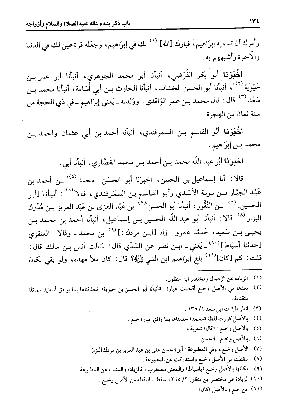 وأمرك أن تسميه إبراهيم فبارك الله (1) لك في إبراهيم وجعله قرة عين لك في الدنيا والآخرة وأشبههم به أخبرنا أبو بكر الفرضي أنبأنا أبو محمد الجوهري أنبأنا أبو عمر بن حيوية (2) أنبأنا أبو الحسن الخشاب أنبأنا الحارث بن أبي أسامة أنبأنا محمد بن سعد (3) قال قال محمد بن عمر الواقدي وولدته يعني إبراهيم في ذي الحجة من سنة ثمان من الهجرة أخبرنا أبو القاسم بن السمرقندي أنبأنا أحمد بن أبي عثمان وأحمد بن محمد بن إبراهيم أخبرنا أبو عبد الله محمد بن أحمد بن محمد القصاري أنبأنا أبي قالا أنا إسماعيل بن الحسن أخبرنا أبو الحسن محمد (4) بن أحمد بن عبد الجبار بن توبة الأسدي وأبو القاسم بن السمرقندي قالا (5) أنبأنا أبو الحسين (6) بن النقور أنبأنا أبو الحسن (7) بن عبد العزى بن عبد العزيز بن مدرك البزار (8) قالا أنبأنا أبو عبد الله بن إسماعيل أنبأنا أحمد بن محمد بن يحيى بن سعيد حدثنا عمرو زاد ابن مردك (9) بن محمد وقالا العنقزي حدثنا أسباط (10) يعني ابن نصر عن السدي قال سألت أنس بن مالك قال قلت كم كان (11) بلغ إبراهيم ابن النبي (صلى الله عليه وسلم) قال كان ملأ مهده ولو بقي لكان