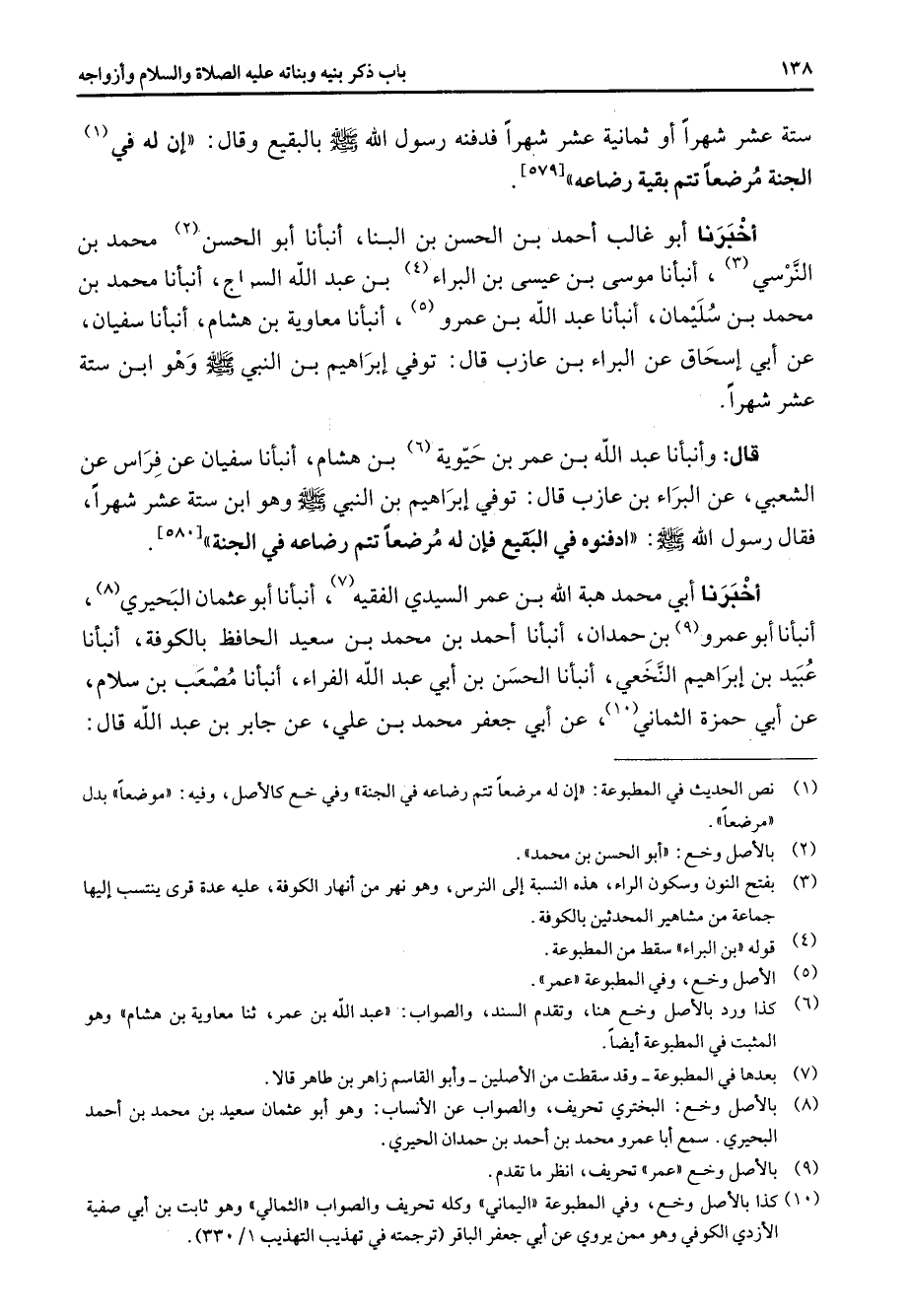 [579] أخبرنا أبو غالب أحمد بن الحسن بن البنا أنبأنا أبو الحسن (2) محمد بن النرسي (3) أنبأنا موسى بن عيسى بن البراء (4) بن عبد الله السراج أنبأنا محمد بن محمد بن سليمان أنبأنا عبد الله بن عمرو (5) أنبأنا معاوية بن هشام أنبأنا سفيان عن أبي إسحاق عن البراء بن عازب قال توفي إبراهيم بن النبي (صلى الله عليه وسلم) وهو ابن ستة عشر شهرا قال وأنبأنا عبد الله بن عمر بن حيوية (6) بن هشام أنبأنا سفيان عن فراس عن الشعبي عن البراء بن عازب قال توفي إبراهيم بن النبي (صلى الله عليه وسلم) وهو ابن ستة عشر شهرا فقال رسول الله (صلى الله عليه وسلم) ادفنوه في البقيع فإن له مرضعا تتم رضاعه في الجنة