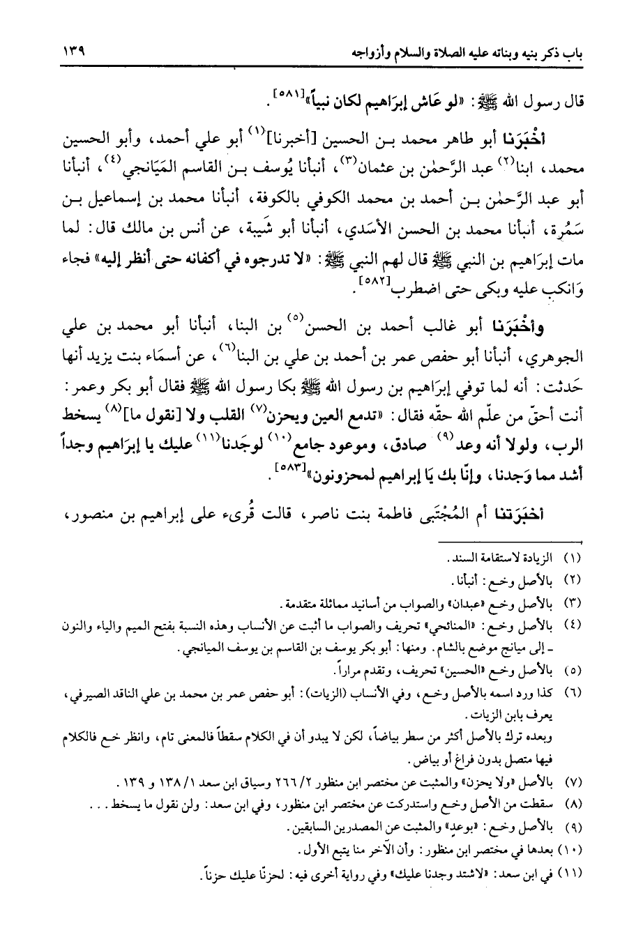[581] أخبرنا أبو طاهر محمد بن الحسين أخبرنا (1) أبو علي أحمد وابو الحسين محمد ابنا (2) عبد الرحمن بن عثمان (3) أنبأنا يوسف بن القاسم الميانجي (4) أنبأنا أبو عبد الرحمن بن أحمد بن محمد الكوفي بالكوفة أنبأنا محمد بن إسماعيل بن سمرة أنبأنا محمد بن الحسن الأسدي أنبأنا أبو شيبة عن أنس بن مالك قال لما مات إبراهيم بن النبي (صلى الله عليه وسلم) قال لهم النبي (صلى الله عليه وسلم) لا تدرجوه في أكفانه حتى أنظر إليه فجاء وانكب عليه وبكى حتى اضطرب