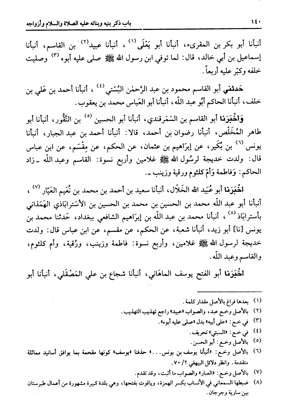 أنبأنا أبو بكر بن المقرئ أنبأنا أبو يعلى (1) أنبأنا عبيد (2) بن القاسم أنبأنا إسماعيل بن أبي خالد قال لما توفي ابن رسول الله (صلى الله عليه وسلم) صلى عليه أبوه (3) وصليت خلفه وكبر عليه أربعا حدثني أبو القاسم محمود بن عبد الرحمن البستي (4) أنبأنا أحمد بن علي بن خلف أنبأنا الحاكم أبو عبد الله أنبأنا أبو العباس محمد بن يعقوب وأخبرنا أبو القاسم بن السمرقندي أنبأنا أبو الحسين (5) بن النقور أنبأنا أبو طاهر المخلص أنبأنا رضوان بن أحمد قالا أنبأنا أحمد بن عبد الجبار أنبأنا يونس (6) بن بكير عن إبراهيم بن عثمان عن الحكم عن مقسم عن ابن عباس قال ولدت خديجة لرسول الله (صلى الله عليه وسلم) غلامين وأربع نسوة القاسم وعبد الله زاد الحاكم وفاطمة وأم كلثوم ورقية وزينب أخبرنا أبو عبيد الله الخلال أنبأنا سعيد بن أحمد بن محمد بن نعيم العيار (7) أنبأنا أبو عبد الله محمد بن الحسين بن محمد بن الحسين بن الاستراباذي الهمذاني باستراباذ (8) انبانا محمد بن عبد الله بن ابراهيم الشافعي ببغداد حدثنا محمد بن يونس نا أبو زيد انبانا الشعبة عن الحكم عن المقسم عن ابن عباس قال: ولدت خديجة لرسول الله صلى الله عليه وآله غلامين واربع نسوة: فاطمة وزينب ورقية وام كلثوم والقاسم وعبد الله اخبرنا أبو الفتح يوسف الماهانى انبانا شجاع بن على المصقلى انبانا أبو