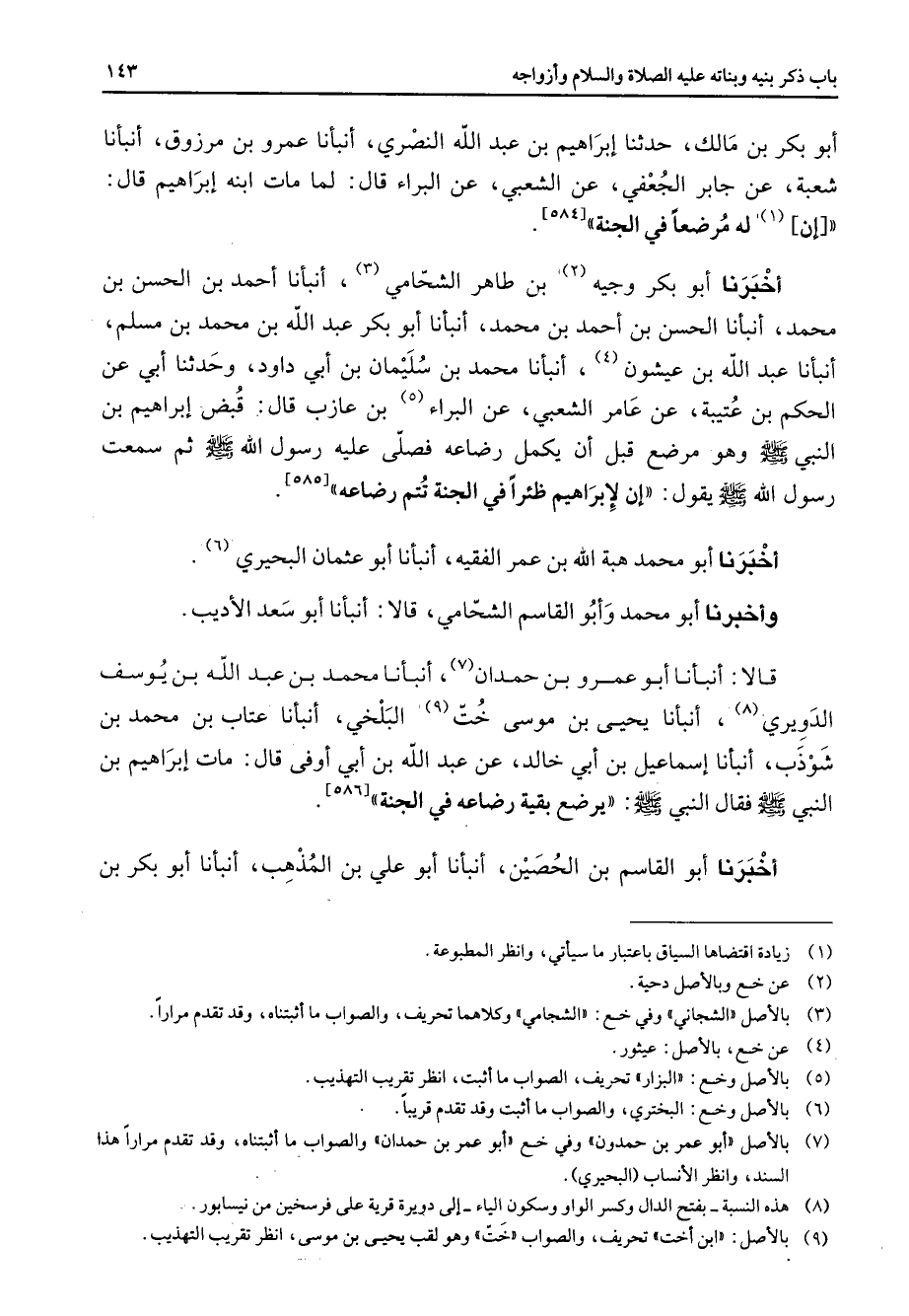 [585] أخبرنا أبو محمد هبة الله بن عمر الفقيه أنبأنا أبو عثمان البحيري (6) وأخبرنا أبو محمد وأبو القاسم الشحامي قالا أنبأنا أبو سعد الأديب قالا أنبأنا أبو عمرو بن حمدان أنبأنا محمد بن عبد الله بن يوسف الدويري (8) أنبأنا يحيى بن موسى خت (9) البلخي أنبأنا عتاب بن محمد بن شوذب أنبأنا إسماعيل بن أبي خالد عن عبد الله بن أبي أوفى قال مات إبراهيم بن النبي (صلى الله عليه وسلم) فقال النبي (صلى الله عليه وسلم) يرضع بقية رضاعه في الجنة