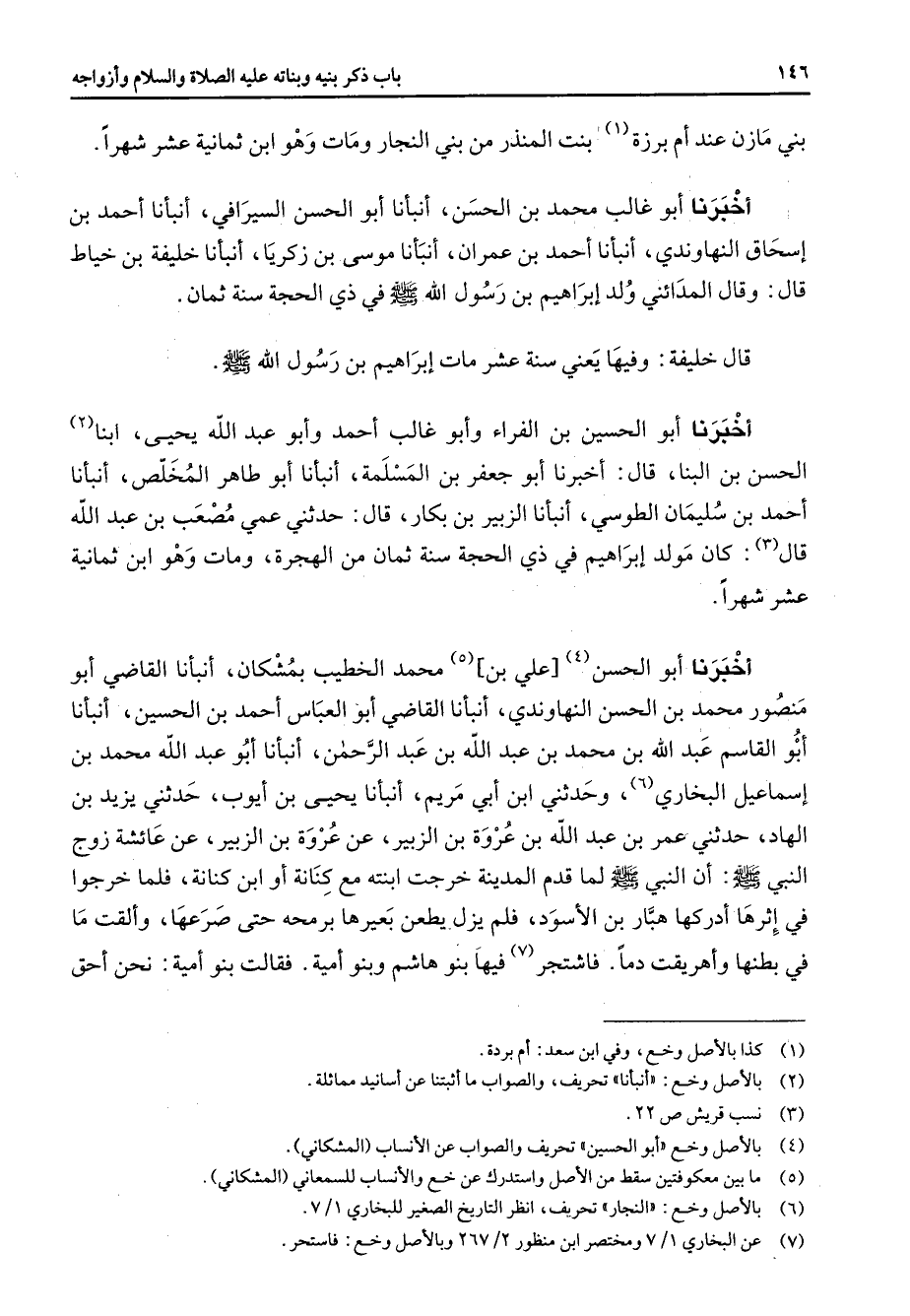 بني مازن عند أم برزة (1) بنت المنذر من بني النجار ومات وهو ابن ثمانية عشر شهرا أخبرنا أبو غالب محمد بن الحسن أنبأنا أبو الحسن السيرافي أنبأنا أحمد بن إسحاق النهاوندي أنبأنا أحمد بن عمران أنبأنا موسى بن زكريا أنبأنا خليفة بن خياط قال وقال المدائني ولد إبراهيم بن رسول الله (صلى الله عليه وسلم) في ذي الحجة سنة ثمان قال خليفة وفيها يعني سنة عشر مات إبراهيم بن رسول الله (صلى الله عليه وسلم) أخبرنا أبو الحسين بن الفراء وأبو غالب أحمد وأبو عبد الله يحيى ابنا (2) الحسن بن البنا قال أخبرنا أبو جعفر بن المسلمة أنبأنا أبو طاهر المخلص أنبأنا أحمد بن سليمان الطوسي أنبأنا الزبير بن بكار قال حدثني عمي مصعب بن عبد الله قال (3) كان مولد إبراهيم في ذي الحجة سنة ثمان من الهجرة ومات وهو ابن ثمانية عشر شهرا أخبرنا أبو الحسن (4) علي بن (5) محمد الخطيب بمشكان أنبأنا القاضي أبو منصور محمد بن الحسن النهاوندي أنبأنا القاضي أبو العباس أحمد بن الحسين أنبأنا أبو القاسم عبد الله بن محمد بن عبد الله بن عبد الرحمن أنبأنا أبو عبد الله محمد بن إسماعيل البخاري (6) وحدثني ابن أبي مريم أنبأنا يحيى بن أيوب حدثني يزيد بن الهاد حدثني عمر بن عبد الله بن عروة بن الزبير عن عروة بن الزبير عن عائشة زوج النبي (صلى الله عليه وسلم) أن النبي (صلى الله عليه وسلم) لما قدم المدينة خرجت ابنته مع كنانة أو ابن كنانة فلما خرجوا في إثرها أدركها هبار بن الأسود فلم يزل يطعن بعيرها برمحه حتى صرعها وألقت ما في بطنها وأهريقت دما فاشتجر (7) فيها بنو هاشم وبنو أمية فقالت بنو أمية نحن أحق