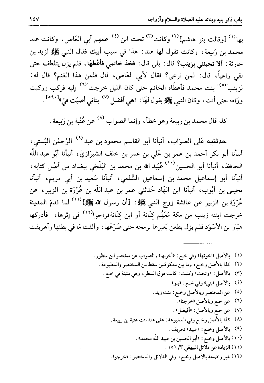 [590] كذا قال محمد بن ربيعة وهو خطأ وإنما الصواب (8) عن عتبة بن ربيعة حدثنيه على الصواب أنبأنا أبو القاسم محمود بن عبد (9) الرحمن البستي أنبأنا أبو بكر أحمد بن عمر بن علي بن عمر بن خلف الشيرازي أنبأنا أبو عبد الله الحافظ أنبأنا أبو الحسين (10) عبيد الله بن محمد بن البلخي ببغداد من أصل كتابه أنبأنا أبو إسماعيل محمد بن إسماعيل السلمي أنبأنا سعيد بن أبي مريم أنبأنا يحيى بن أيوب أنبأنا ابن الهاد حدثني عمر بن عبد الله بن عروة بن الزبير عن عروة بن الزبير عن عائشة زوج النبي (صلى الله عليه وسلم) أن رسول الله (صلى الله عليه وسلم) (11) لما قدم المدينة خرجت ابنته زينب من مكة معهم كنانة أو ابن كنانة فراحوا (12) في إثرها فأدركها هبار بن الأسود فلم يزل يطعن بعيرها برمحه حتى صرعها وألقت ما في بطنها وأهريقت