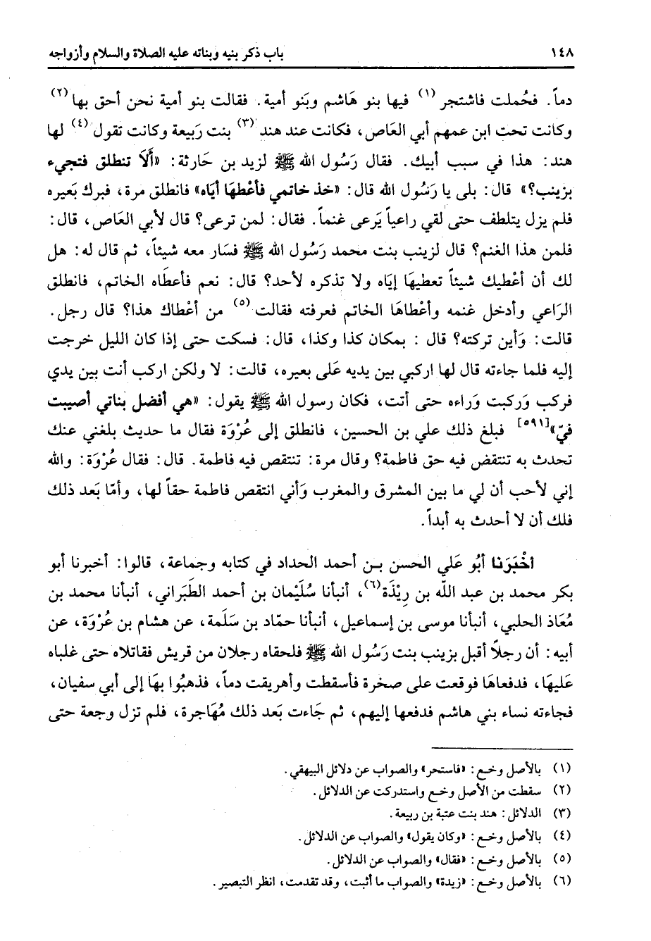 دما فحملت فاشتجر (1) فيها بنو هاشم وبنو أمية فقالت بنو أمية نحن أحق بها (2) وكانت تحت ابن عمهم أبي العاص فكانت عند (3) هند بنت ربيعة وكانت تقول (4) لها هند هذا في سبب أبيك فقال رسول الله (صلى الله عليه وسلم) لزيد بن حارثة ألا تنطلق فتجئ بزينب قال بلى يا رسول الله قال خذ خاتمي فأعطها إياه فانطلق مرة فبرك بعيره فلم يزل يتلطف حتى لقي راعيا يرعى غنما فقال لمن ترعى قال لأبي العاص قال فلمن هذا الغنم قال لزينب بنت محمد رسول الله (صلى الله عليه وسلم) فسار معه شيئا ثم قال له هل لك أن أعطيك شيئا تعطيها إياه ولا تذكره لأحد قال نعم فأعطاه الخاتم فانطلق الراعي وأدخل غنمه وأعطاها الخاتم فعرفته فقالت (5) من أعطاك هذا قال رجل قالت وأين تركته قال بمكان كذا وكذا قال فسكت حتى إذا كان الليل خرجت إليه فلما جاءته قال لها اركبي بين يديه على بعيره قالت لا ولكن اركب أنت بين يدي فركب وركبت وراءه حتى أتت فكان رسول الله (صلى الله عليه وسلم) يقول هي أفضل بناتي أصيبت في
