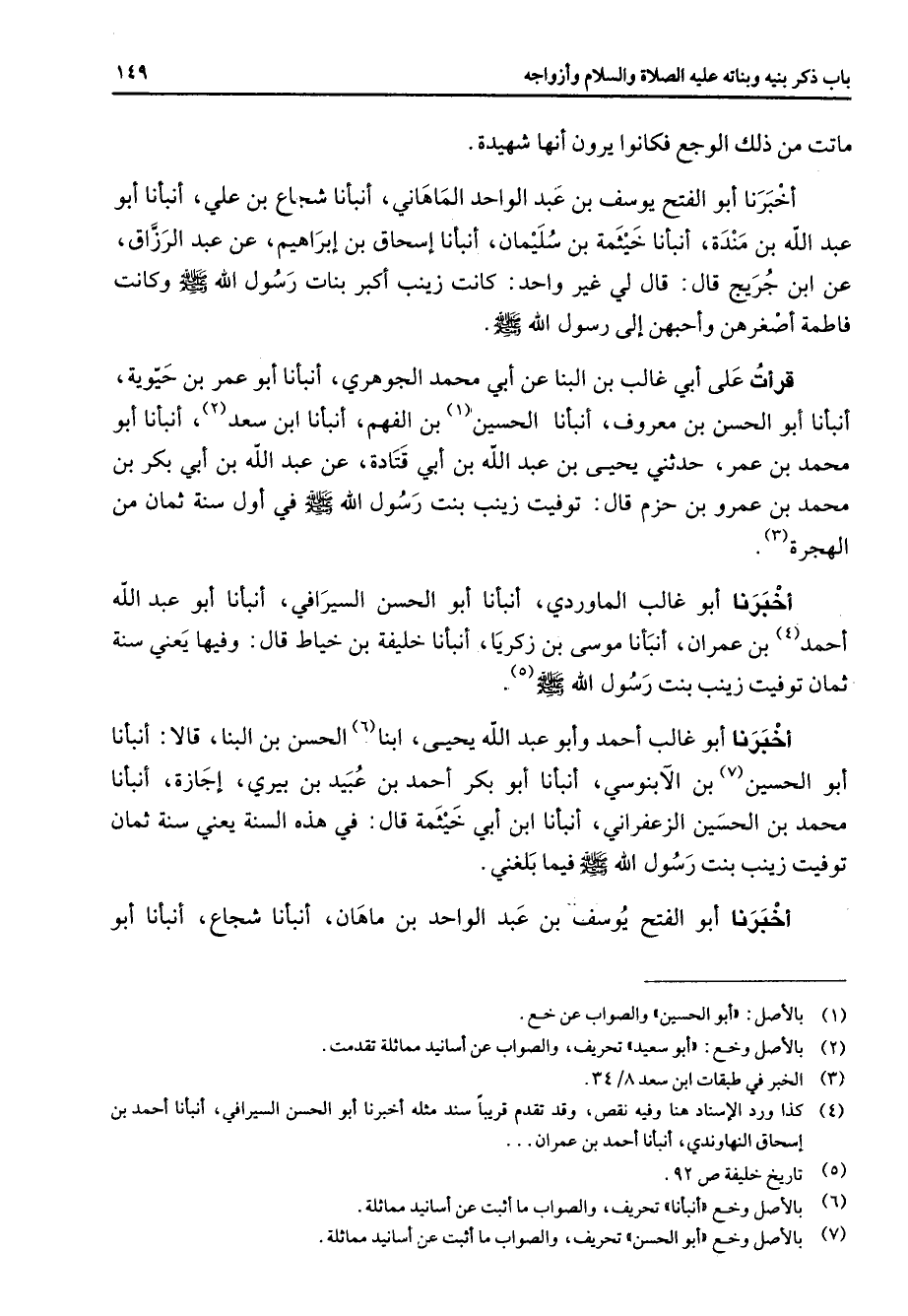 ماتت من ذلك الوجع فكانوا يرون أنها شهيدة أخبرنا أبو الفتح يوسف بن عبد الواحد الماهاني أنبأنا شجاع بن علي أنبأنا أبو عبد الله بن مندة أنبأنا خيثمة بن سليمان أنبانا إسحاق بن إبراهيم عن عبد الرزاق عن ابن جريج قال قال لي غير واحد كانت زينب أكبر بنات رسول الله (صلى الله عليه وسلم) وكانت فاطمة أصغرهن وأحبهن إلى رسول الله (صلى الله عليه وسلم) قرأت على أبي غالب بن البنا عن أبي محمد الجوهري أنبأنا أبو عمر بن حيوية أنبأنا أبو الحسن بن معروف أنبأنا الحسين (1) بن الفهم أنبأنا ابن سعد (2) أنبأنا أبو محمد بن عمر حدثني يحيى بن عبد الله بن أبي قتادة عن عبد الله بن أبي بكر بن محمد بن عمرو بن حزم قال توفيت زينب بنت رسول الله (صلى الله عليه وسلم) في أول سنة ثمان من الهجرة (3) أخبرنا أبو غالب الماوردي أنبأنا أبو الحسن السيرافي أنبأنا أبو عبد الله أحمد (4) بن عمران أنبأنا موسى بن زكريا أنبأنا خليفة بن خياط قال وفيها يعني سنة ثمان توفيت زينب بنت رسول الله (صلى الله عليه وسلم) (5) أخبرنا أبو غالب أحمد وأبو عبد الله يحيى ابنا (6) الحسن بن البنا قالا أنبأنا أبو الحسين (7) بن الآبنوسي أنبأنا أبو بكر أحمد بن عبيد بن بيري إجازة أنبأنا محمد بن الحسين الزعفراني أنبأنا ابن أبي خيثمة قال في هذه السنة يعني سنة ثمان توفيت زينب بنت رسول الله (صلى الله عليه وسلم) فيما بلغني أخبرنا أبو الفتح يوسف بن عبد الواحد بن ماهان أنبأنا شجاع أنبأنا أبو