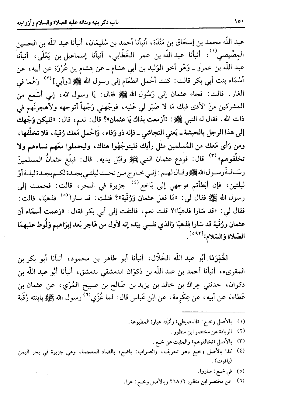 عبد الله محمد بن إسحاق بن مندة أنبأنا أحمد بن سليمان أنبأنا عبد الله بن الحسين المصيصي (1) أنبأنا عبد الله بن عمر الخطابي أنبأنا إسماعيل بن يعلى أنبأنا عبد الله بن عمرو وهو أخو الوليد بن أبي هشام عن هشام بن عروة عن أبيه عن أسماء بنت أبي بكر قالت كنت أحمل الطعام إلى رسول الله (صلى الله عليه وسلم) وأبي (2) وهما في الغار قالت فجاء عثمان إلى رسول الله (صلى الله عليه وسلم) فقال يا رسول الله إني أسمع من المشركين من الأذى فيك ما لا صبر لي عليه فوجهني وجها أتوجهه ولأهجرنهم في ذات الله فقال له النبي (صلى الله عليه وسلم) أزمعت بذاك يا عثمان قال نعم قال فليكن وجهك إلى هذا الرجل بالحبشة يعني النجاشي فإنه ذو وفاء واحمل معك رقية فلا تخلفها ومن رأى معك من المسلمين مثل رأيك فليتوجهوا هناك وليحملوا معهم نساءهم ولا تخلفوهم (3) قال فودع عثمان النبي (صلى الله عليه وسلم) وقبل يديه قال فبلغ عثمان المسلمين رسالة رسول الله (صلى الله عليه وسلم) وقال لهم إني خارج من تحت ليلتي بجدة لكم بجدة ليلة أو ليلتين فإن أبطأتم فوجهي إلى باخع (4) جزيرة في البحر قالت فحملت إلى رسول الله (صلى الله عليه وسلم) فقال لي ما فعل عثمان ورقية فقلت قد سارا (5) فذهبا قالت فقال لي قد سارا فذهبا قلت نعم فالتفت إلى أبي بكر فقال زعمت أسماء أن عثمان ورقية قد سارا فذهبا والذي نفسي بيده إنه لأول من هاجر بعد إبراهيم ولوط عليهما الصلاة والسلام