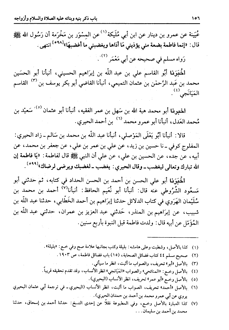 [598] انتهى رواه مسلم في صحيحه عن أبي معمر (2) أخبرنا أبو القاسم علي بن عبد الله بن إبراهيم الحسيني أنبأنا أبو الحسين محمد بن عبد الرحمن بن عثمان التميمي أنبأنا القاضي أبو بكر يوسف بن (3) القاسم الميانجي (4) أخبرنا أبو محمد هبة الله بن سهل بن عمر الفقيه أنبأنا أبو عثمان (5) سعيد بن محمد العدل أنبأنا أبو عمرو محمد (6) بن أحمد الحيري قالا أنبأنا أبو يعلى الموصلي أنبأنا عبد الله بن محمد بن سالم زاد الحيري المفلوج كوفي نا حسين بن زيد عن علي بن عمر بن علي عن جعفر بن محمد عن أبيه عن جده عن الحسين بن علي عن علي أن النبي (صلى الله عليه وسلم) قال لفاطمة يا فاطمة إن