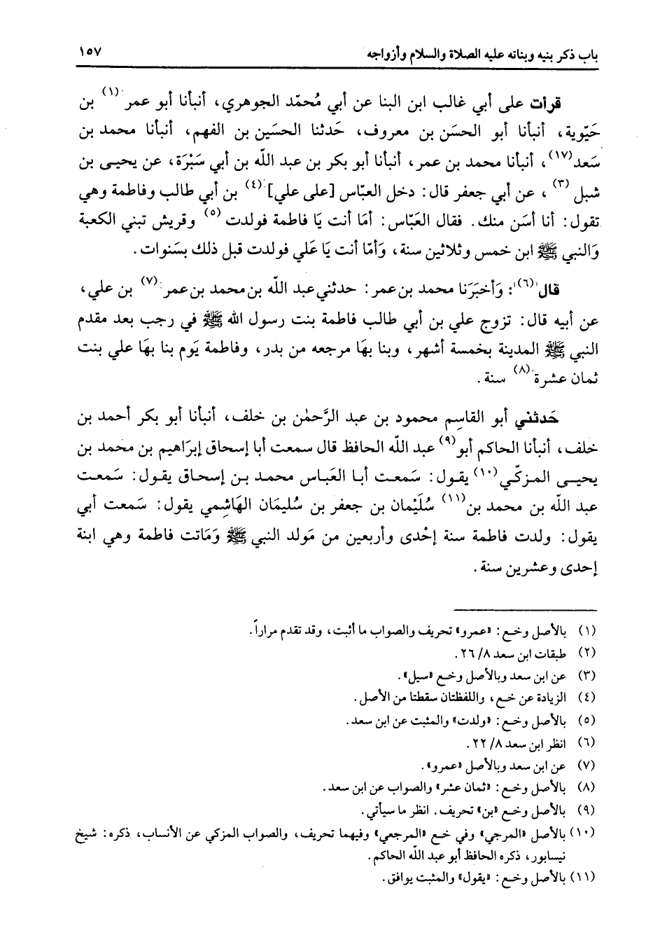 قرأت على أبي غالب ابن البنا عن أبي محمد الجوهري أنبأنا أبو عمر (1) بن حيوية أنبأنا أبو الحسن بن معروف حدثنا الحسين بن الفهم أنبأنا محمد بن سعد (17) أنبأنا محمد بن عمر أنبأنا أبو بكر بن عبد الله بن أبي سبرة عن يحيى بن شبل (3) عن أبي جعفر قال دخل العباس على علي (4) بن أبي طالب وفاطمة وهي تقول أنا أسن منك فقال العباس أما أنت يا فاطمة فولدت (5) وقريش تبني الكعبة والنبي (صلى الله عليه وسلم) ابن خمس وثلاثين سنة وأما أنت يا علي فولدت قبل ذلك بسنوات قال (6) وأخبرنا محمد بن عمر حدثني عبد الله بن محمد بن عمر (7) بن علي عن أبيه قال تزوج علي بن أبي طالب فاطمة بنت رسول الله (صلى الله عليه وسلم) في رجب بعد مقدم النبي (صلى الله عليه وسلم) المدينة بخمسة أشهر وبنا بها مرجعه من بدر وفاطمة يوم بنا بها علي بنت ثمان عشرة (8) سنة حدثني أبو القاسم محمود بن عبد الرحمن بن خلف أنبأنا أبو بكر أحمد بن خلف أنبأنا الحاكم أبو (9) عبد الله الحافظ قال سمعت أبا إسحاق إبراهيم بن محمد بن يحيى المزكي (10) يقول سمعت أبا العباس محمد بن إسحاق يقول سمعت عبد الله بن (11) محمد بن سليمان بن جعفر بن سليمان الهاشمي يقول سمعت أبي يقول ولدت فاطمة سنة إحدى وأربعين من مولد النبي (صلى الله عليه وسلم) وماتت فاطمة وهي ابنة إحدى وعشرين سنة